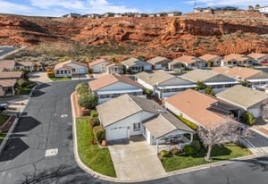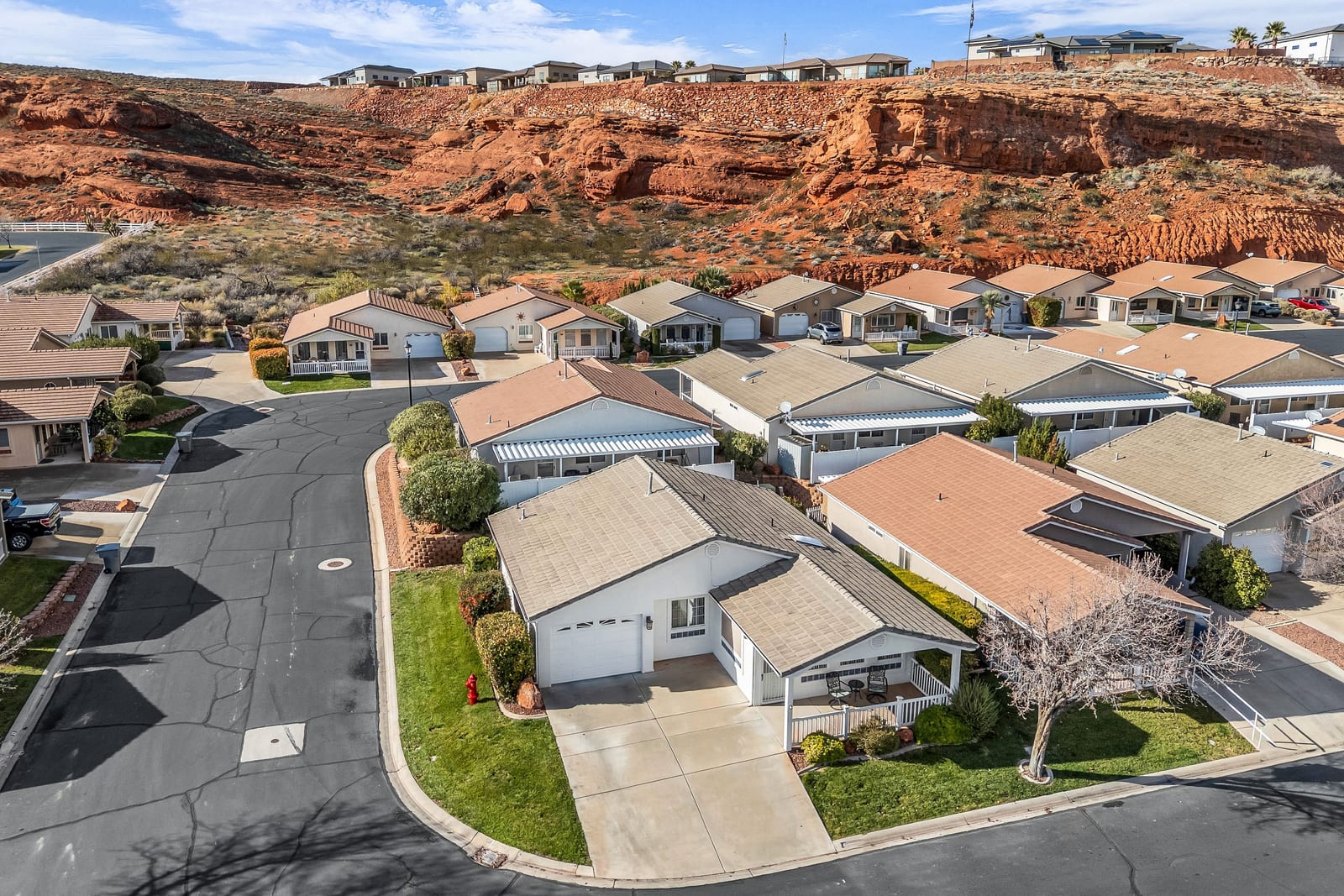 Prepare to be captivated by this enchanting two-bedroom retreat in the highly sought-after Canyon Cove 55+ community-where postcard-perfect Southern Utah scenery becomes your everyday backdrop. Step inside to a warm, welcoming open-concept floor plan that effortlessly blends comfort and style. The heart of the home is a kitchen boasting newer appliances, ample counter space, and plenty of room for everything from casual breakfasts to intimate gatherings-turning meal prep into pure enjoyment. Flow seamlessly into the generous front gathering room, ideal for entertaining friends or simply relaxing with loved ones. The thoughtfully designed layout includes two cozy bedrooms and two full bathrooms, offering smart proportions and peaceful privacy for everyday living. Escape to your private covered porch, where you can savor morning breakfast while breathing in the crisp, invigorating Southern Utah air and soaking up those breathtaking red rock views that never lose their magic. Practical elegance continues with a dedicated mud/laundry room off the extra-deep garage-perfect for hobbies, projects, or keeping life organized. As a resident of this premier adult community, you'll enjoy fantastic amenities including a clubhouse for games and social events, an indoor heated pool, and hot tub-all designed for an active, vibrant lifestyle. The HOA thoughtfully covers exterior water usage, freeing you from one more chore. Perfectly positioned in a serene yet convenient spot, Canyon Cove offers easy access to the freeway, shopping, dining, entertainment, and world-class biking and hiking trails amid stunning red rock landscapes. This is the best-priced gem in the neighborhood-truly a rare opportunity to embrace the relaxed, sun-drenched Southern Utah lifestyle you've been dreaming of. Don't wait-schedule your private showing today and experience firsthand why this delightful home in Canyon Cove deserves to be your next chapter. New Paint, Carpet and Epoxied Garage Floor!