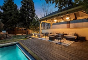 The backyard includes a pool, hot tub, heated cabana, and flagstone terraces designed for everyday use as much as entertaining.