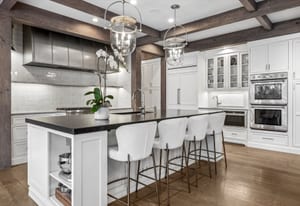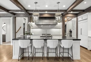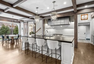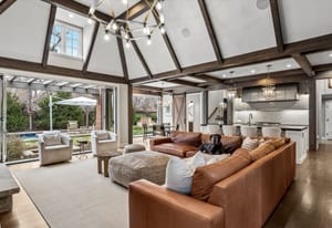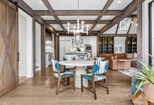 The main level is centered around a chef’s kitchen with Thermador appliances and an oversized island, opening to a family room with beamed ceilings, custom built ins, and fireplace. Large accordion doors connect directly to the outdoor living areas.