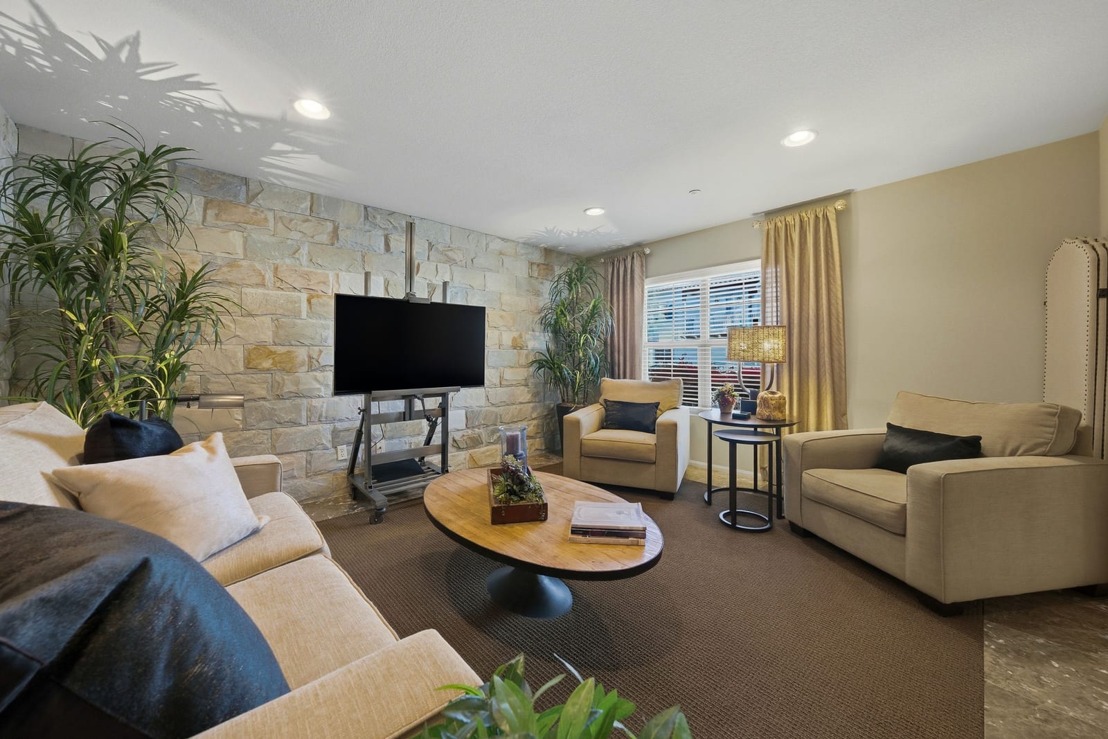 The gourmet kitchen features slab granite countertops and stainless-steel appliances, seamlessly flowing into the living and dining areas in true open-concept style —ideal for entertaining. The primary suite offers a serene retreat with an en-suite bath, complemented by premium high-end carpeting in both bedrooms and elegantly inset within a tile border in the living room for exceptional warmth and sophistication; the second bedroom and bath provide comfortable accommodations for guests. Direct-access two-car garage, ground-level entry with accessibility ramp, and a prime interior corner location just steps from the clubhouse, fitness center, and lush greenbelt complete this low-maintenance sanctuary.