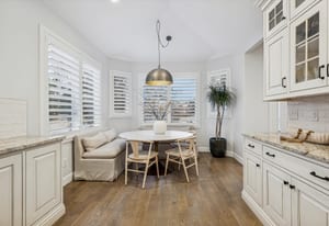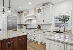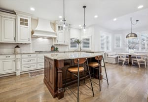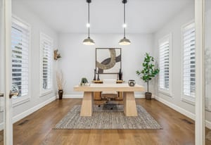 The gourmet kitchen is both elegant and functional, featuring granite countertops, a timeless subway tile backsplash, stainless steel appliances, double ovens, and an expansive center island—ideal for everyday living and entertaining alike. A private office with French doors and custom built-ins creates a refined work-from-home retreat.
