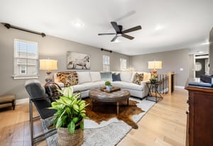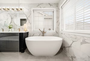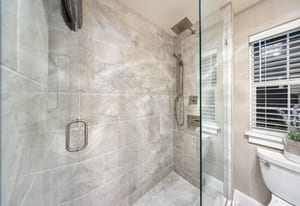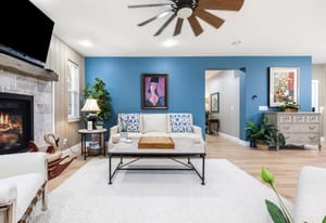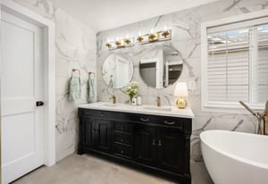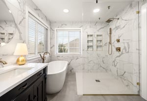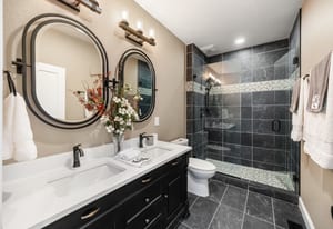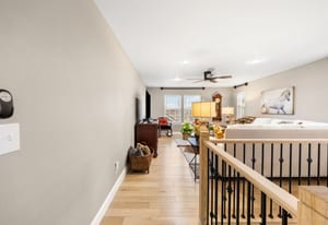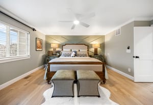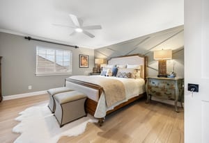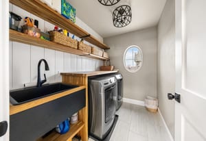 Upstairs includes a second living area, the primary suite, three additional bedrooms, a full bath, and a remodeled laundry room. The primary suite features a spa-inspired bathroom with a soaking tub, frameless glass walk-in shower with rain heads, double vanity, custom lighting, and a walk-in closet with built-in shelving.