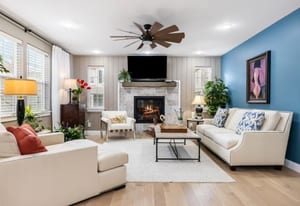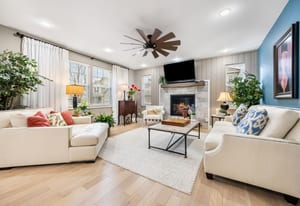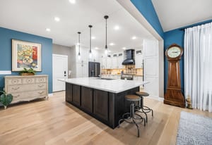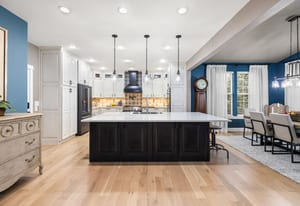 The gourmet kitchen is a true centerpiece with custom wood cabinetry, soft-close drawers, a full quartz slab island, apron-front sink, and Smart GE Café appliances, including a six-burner gas range, double ovens, microwave drawer, and refrigerator. Designer lighting includes under-cabinet lighting, pendants, and a statement chandelier.
