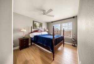 The main level also offers a private bedroom with two closets, a bay window, and a beautifully remodeled bathroom with a walk-in shower. The living room features a custom gas fireplace, while the dining area opens to a private patio, perfect for outdoor dining and grilling.