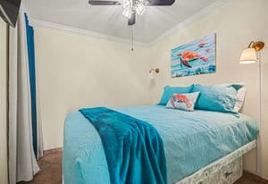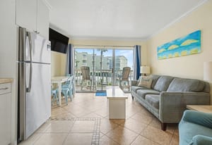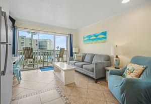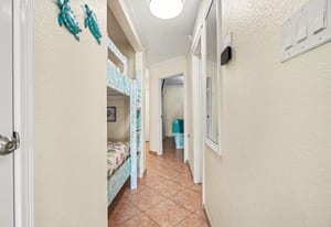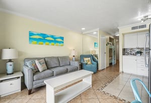 The condo comfortably sleeps up to six guests, with bunk beds in the hallway and a sleeper sofa in the living room, offering flexible sleeping arrangements for families or groups. Coastal décor and furnishings create a relaxed, welcoming atmosphere, and the unit is being sold fully furnished and turn-key, ready for personal enjoyment or immediate rental use.