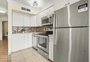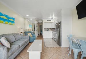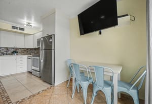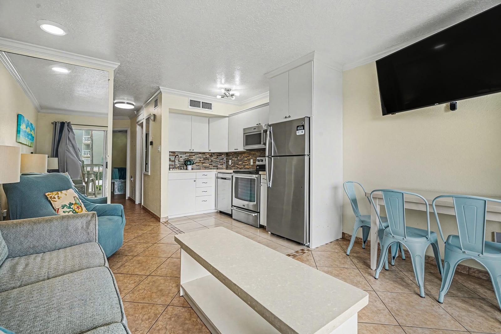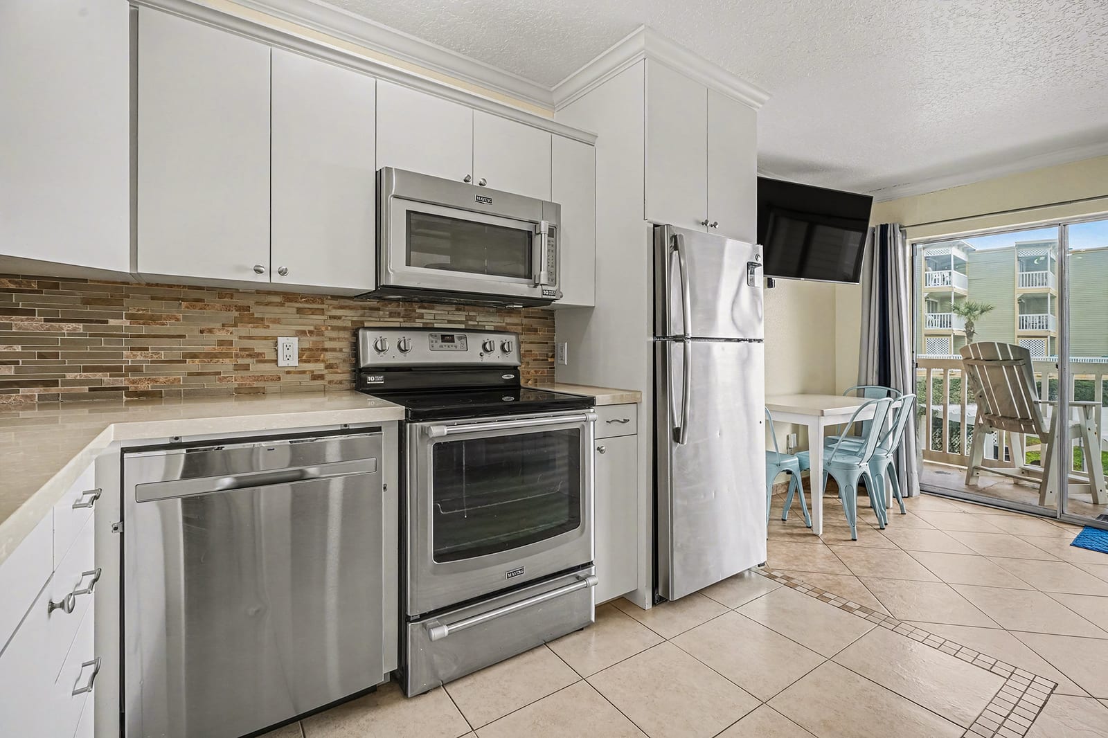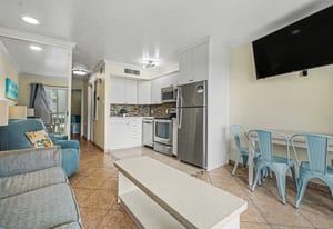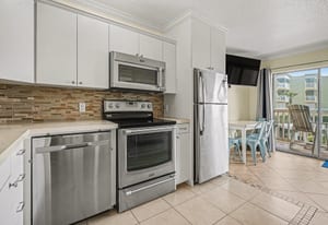 Inside, the unit has been completely updated and thoughtfully designed for comfort and style. Tile flooring throughout adds a clean, modern feel and is perfect for beach living. One of the standout features of this condo is the rare full-size kitchen, a true bonus at The Victorian. The kitchen is equipped with a stainless steel appliance package, including a full-size range, dishwasher, microwave, and refrigerator, making extended stays and family meals easy and convenient.