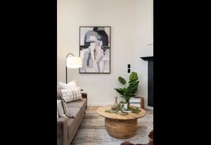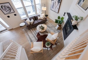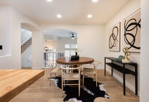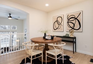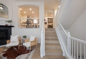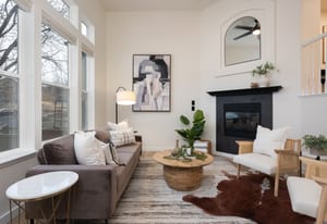 living room with a cozy gas fireplace, overlooked by the dining area, and kitchen with island seating—perfect for