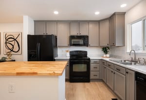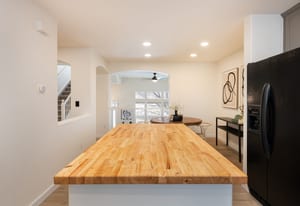 butcher block island, and ample space for cooking and gathering. The highly sought-after open floor plan offers a spacious