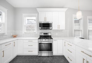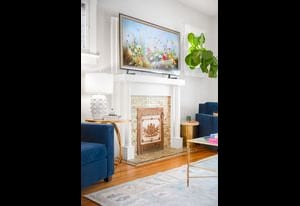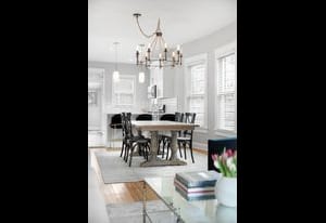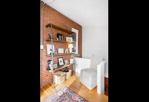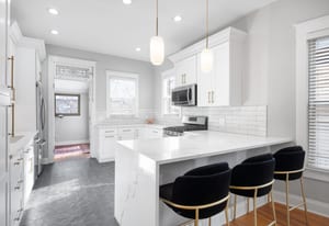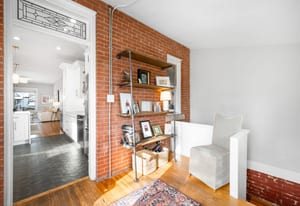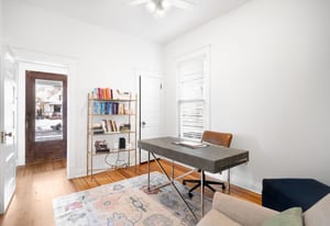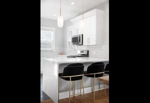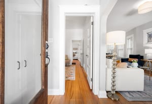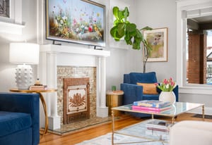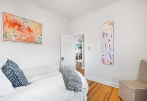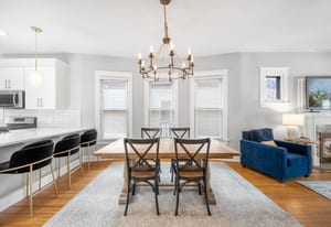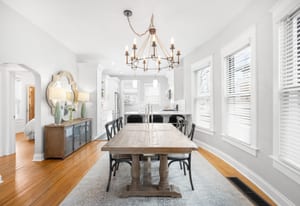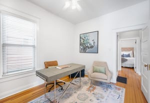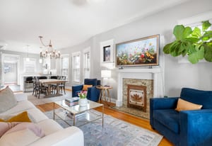Inside, a bright, open layout showcases 12-foot ceilings and original hardwood floors throughout. The living room, dining area, and kitchen flow seamlessly, creating an ideal space for entertaining. The remodeled kitchen (2022) features quartz countertops, ample cabinetry, and Samsung appliances.