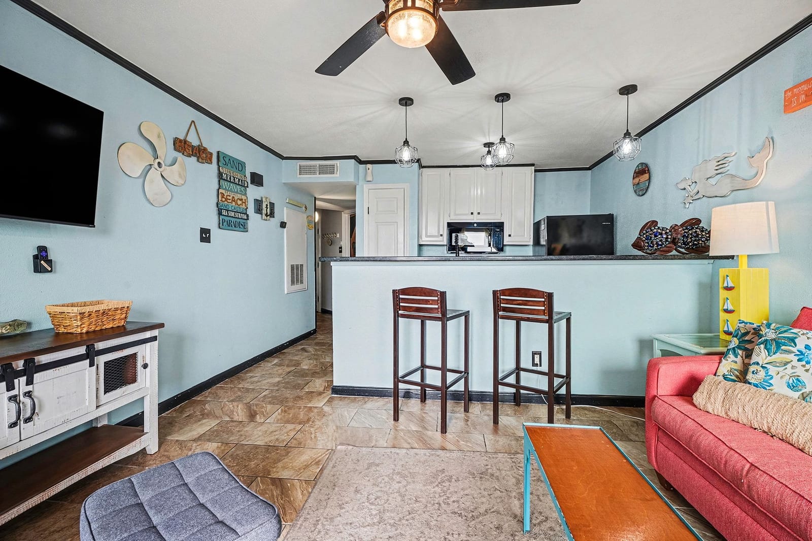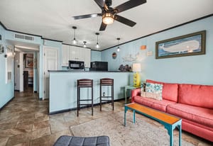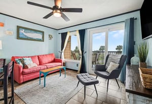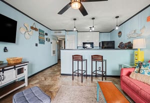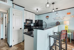 Welcome to coastal living at Maravilla! This 2nd-floor 1/1 condo is perfectly located on the Galveston Seawall, just minutes from the beach, Moody Gardens, Schlitterbahn, The Strand, shopping, dining, and all the fun Galveston has to offer. Designed for comfort and easy beach living, the unit features tile flooring throughout and a full-size kitchen with refrigerator, range, microwave, and dishwasher—perfect for longer stays. The layout comfortably sleeps up to six with built-in bunk beds featuring full-size mattresses, and kids will love having their own TVs, plus a sleeper sofa in the living area. Offered fully furnished and turn-key. Enjoy Maravilla’s resort-style amenities including a heated pool, hot tub, fitness center, beach access, and lush tropical grounds. Ideal as a vacation getaway or income-producing rental!