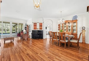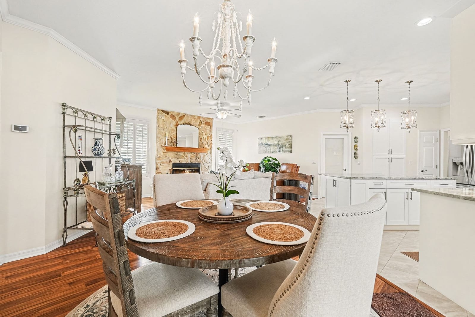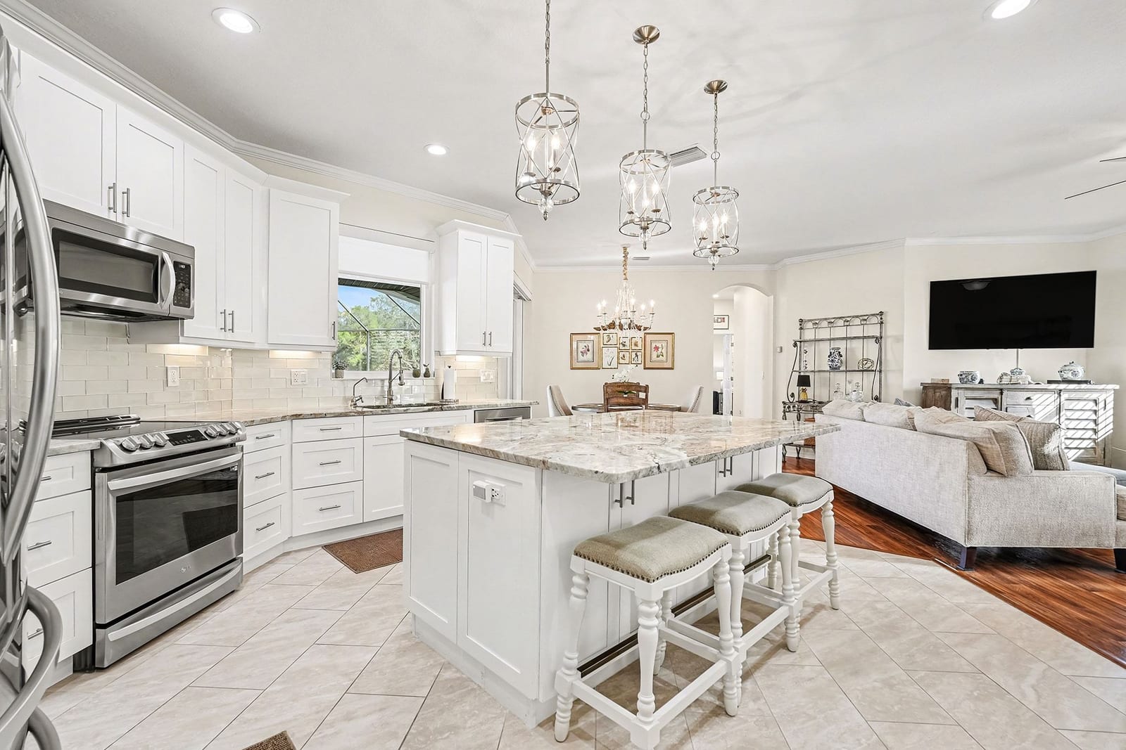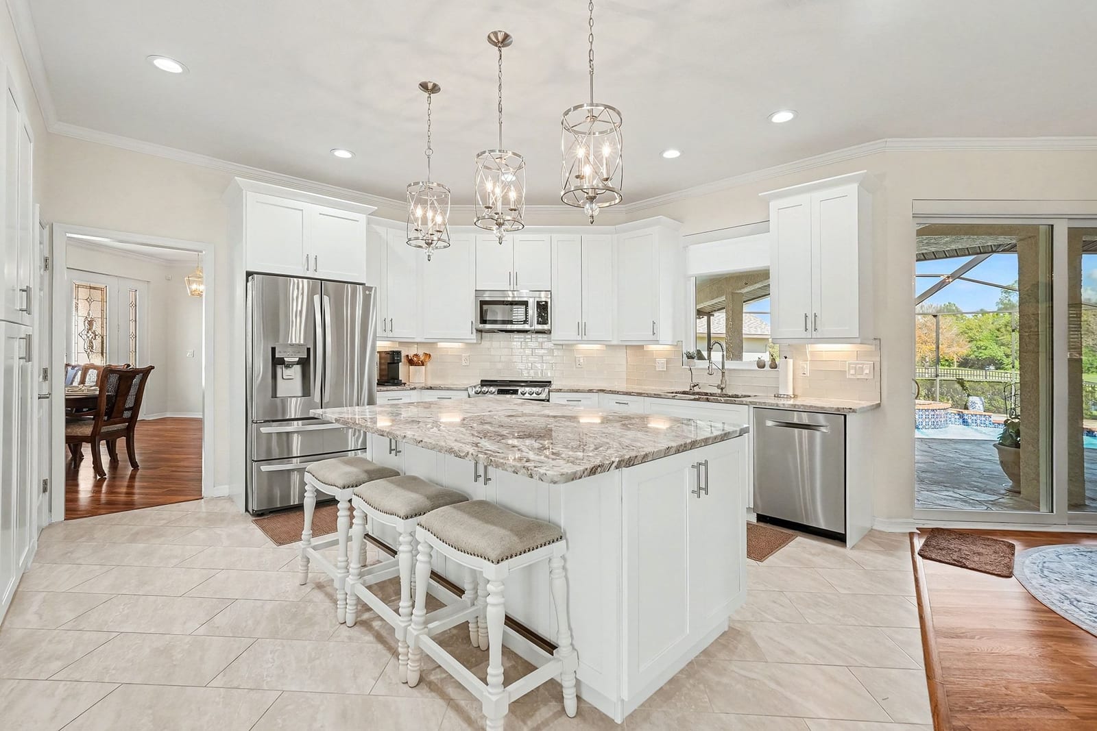 The 2,440 sq ft split-bedroom floor plan features a seamless flow ideal for entertaining and everyday living. The gourmet kitchen includes 42” light cabinetry, Fantasy Brown granite countertops, subway tile backsplash, upgraded lighting, a large center island, and newer stainless steel appliances, opening to the family room and breakfast nook with pool views.