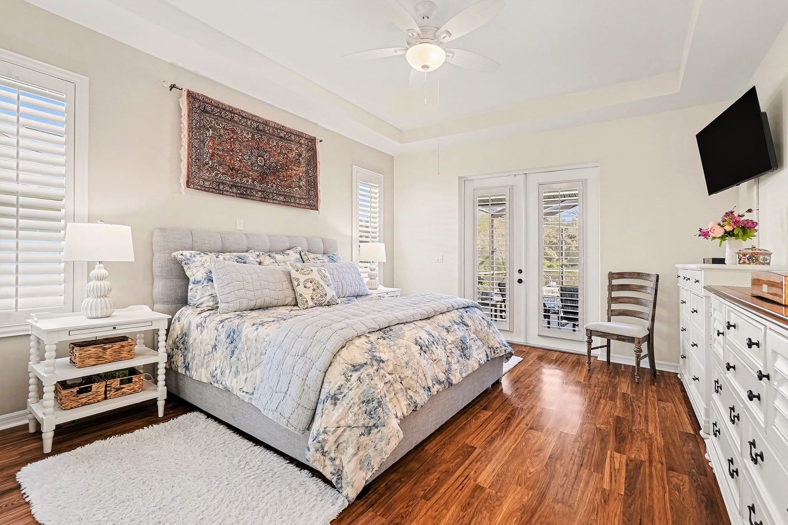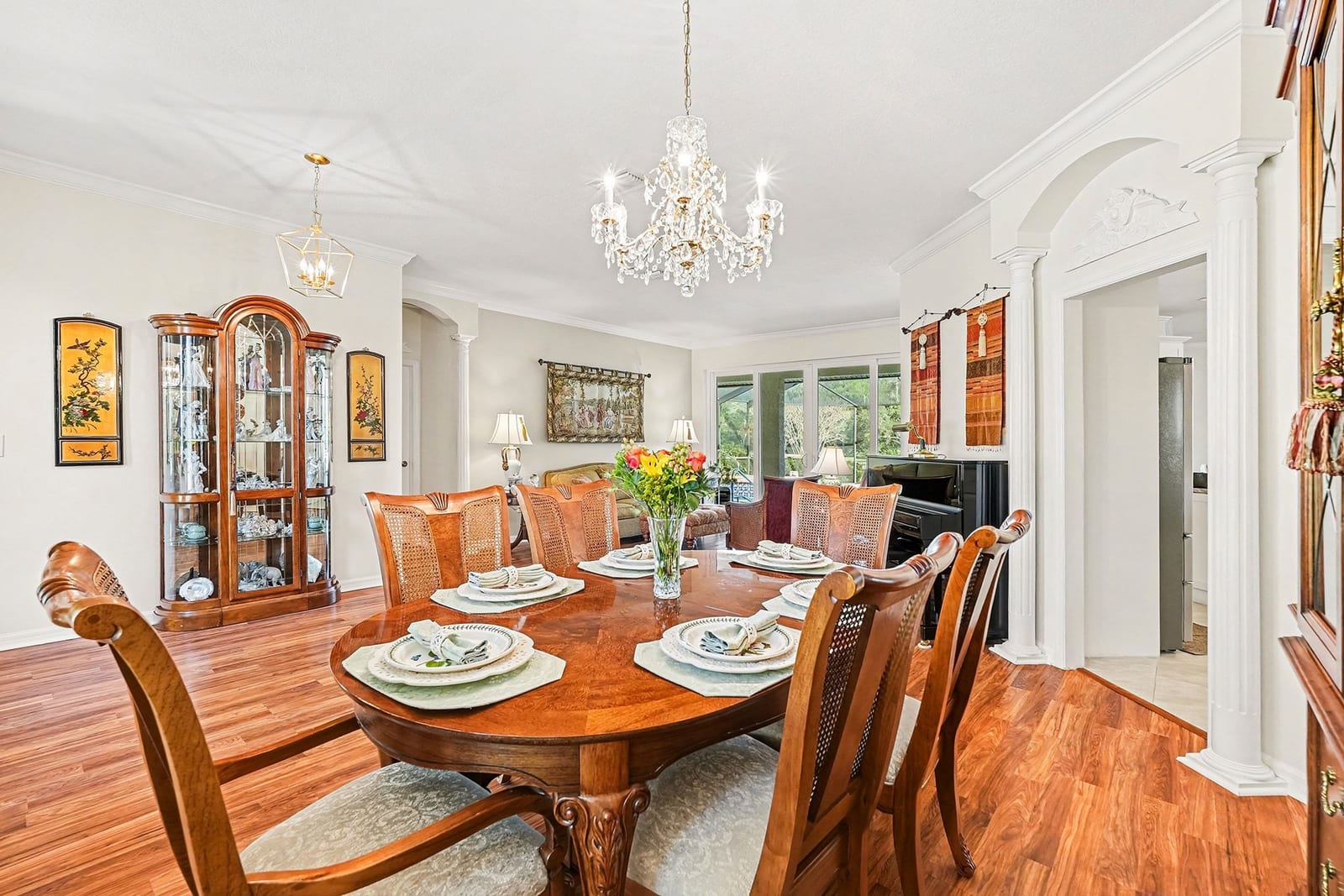 Formal living and dining rooms add elegance with architectural columns and a crystal chandelier, while the family room is highlighted by a wood-burning stone fireplace. The primary suite offers French doors to the pool, tray ceiling, dual closets, linen closet, and a recently updated spa-inspired bath with glass-enclosed shower, soaking tub, dual quartz vanities, and a private water closet. A secondary bath also features quartz countertops, and a convenient half bath is located in the garage.