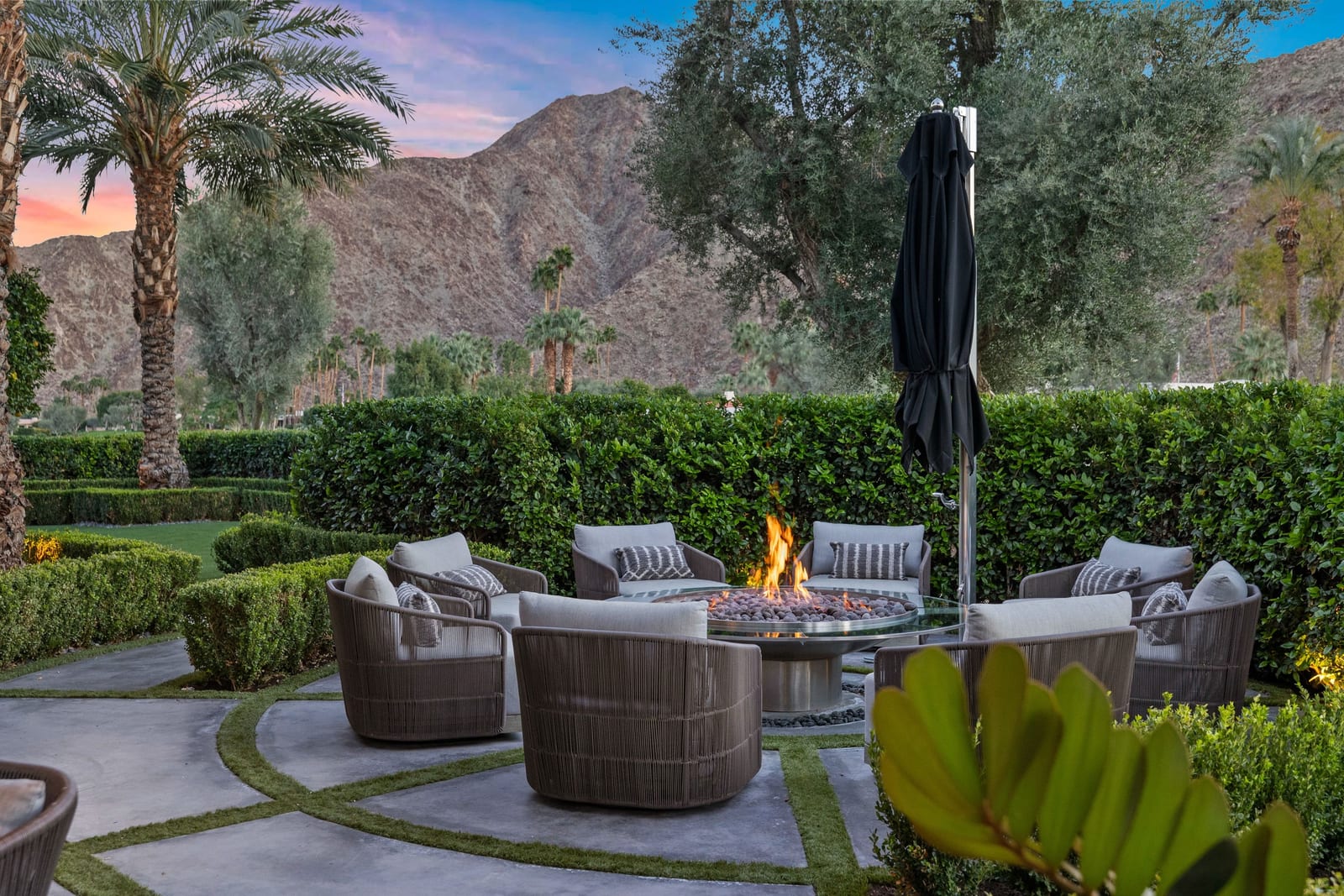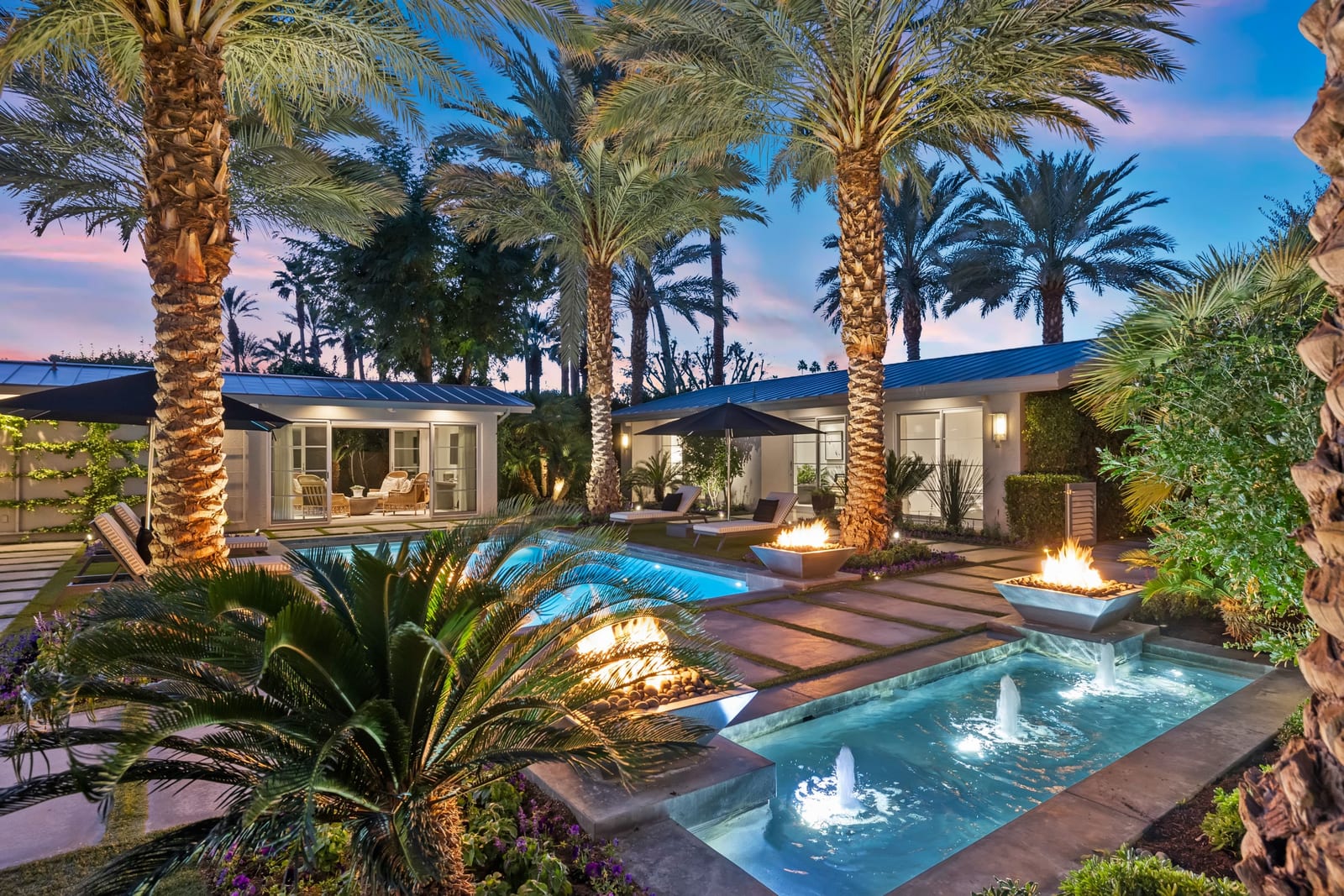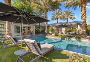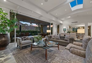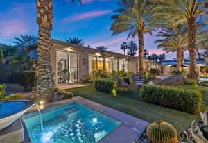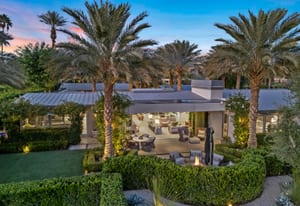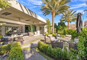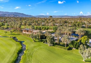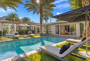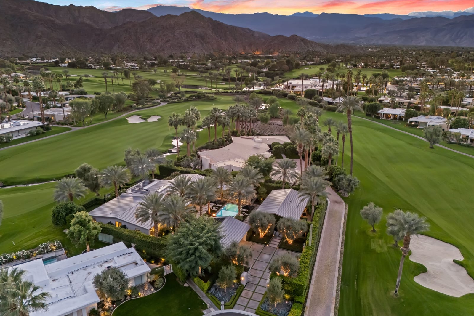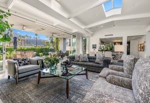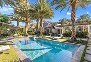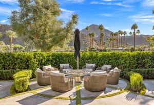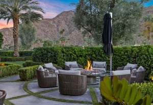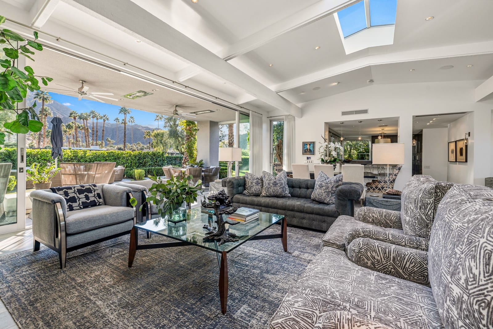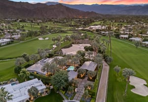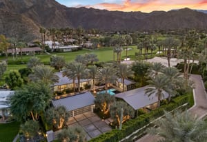 Premier south-facing 13th fairway location within the gates of Eldorado Country Club. This sensational property captures dramatic views of Mt. Eisenhower and a high level of seclusion. A gated entry, at the end of a quiet cul-de-sac, leads to immaculately landscaped grounds curated for both privacy and outdoor enjoyment. Remodeled down to the studs in 2018, the home presents striking contemporary architecture with clean lines, a neutral palette, and walls of glass that frame the impressive mountain backdrop. The great room showcases soaring vaulted ceilings, an elongated skylight, and a wood-burning fireplace, creating an open, light-filled living environment. A glass-enclosed office is positioned adjacent to the great room. Outdoor living areas are intentionally planned and include a courtyard pool patio with four fire bowls flanking the central walkway between the pool and a fountain reflection pool. The fairway patio is perimeter landscaped for privacy and highlights expansive views and a generous circular fire pit—ideal for entertaining or enjoying cool desert evenings. The gourmet kitchen is appointed with a center island, oversized walk-in pantry, and a sit-down bar counter adjacent to the formal dining area. The primary suite with fireplace features a dedicated office retreat, dual closets, and a spa-inspired bath opening to an outdoor shower. A gym, with bath, can easily be converted to a bedroom suite. The well-appointed guest house with kitchenette includes two spacious ensuite bedrooms, each with a sitting area. A pool cabana with living space, laundry room, and bathroom can also function as a private casita. This extraordinary residence brings together modern architectural design, privacy, and a prime fairway setting in one of Eldorado's most desirable locations.
