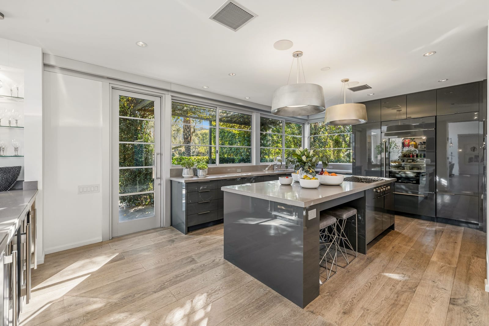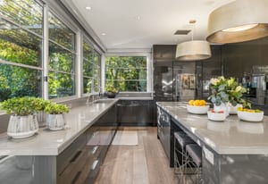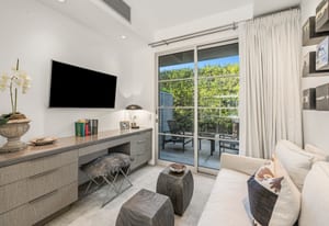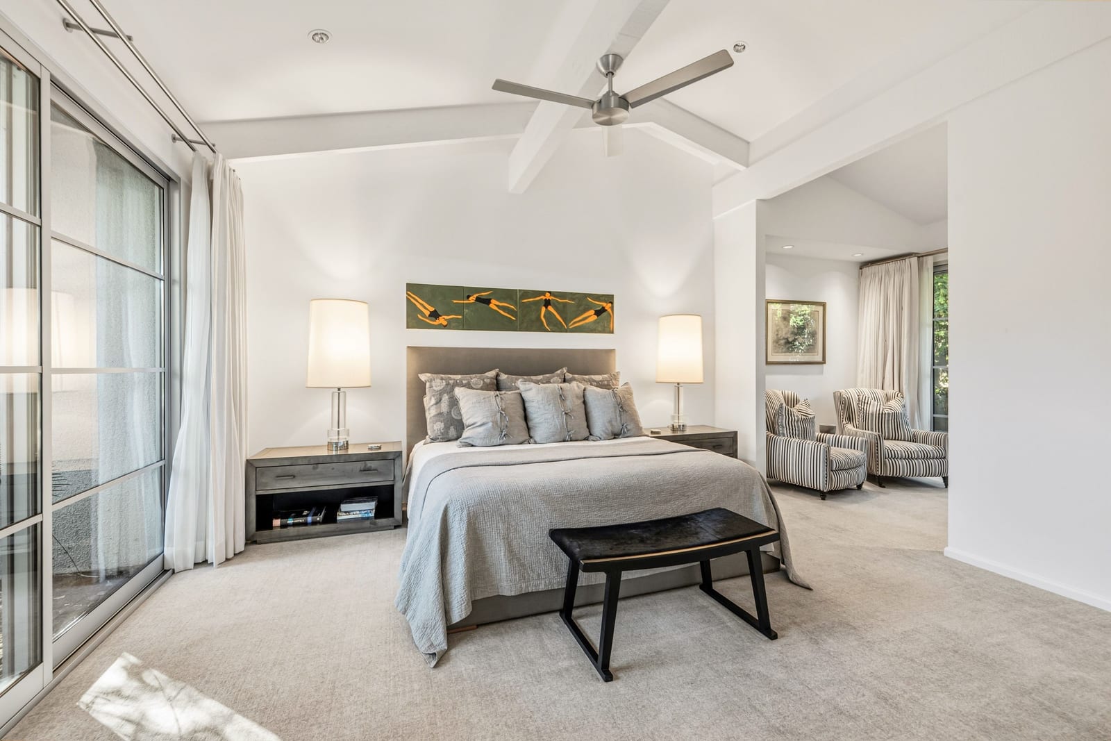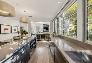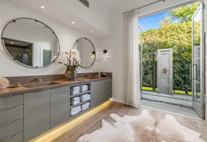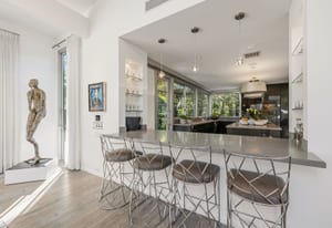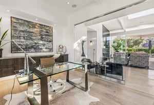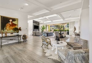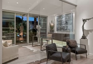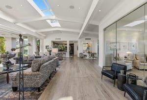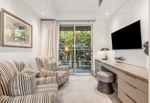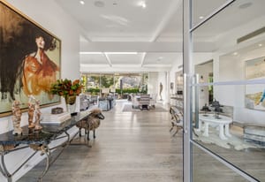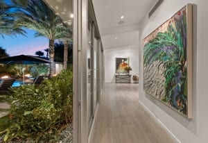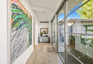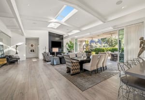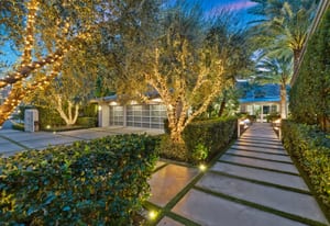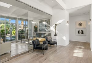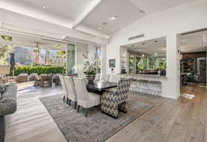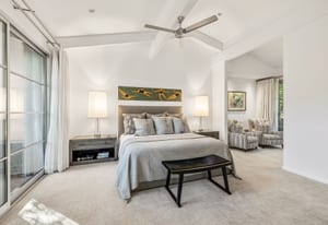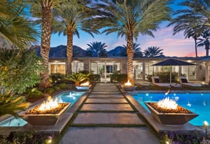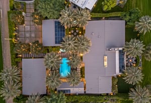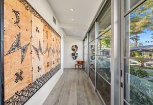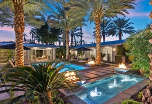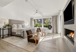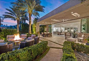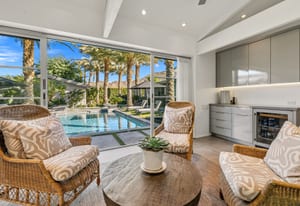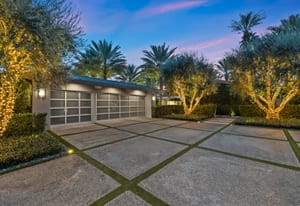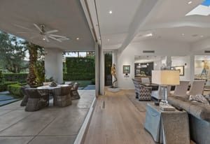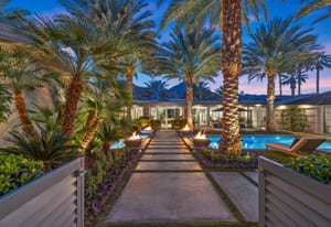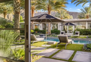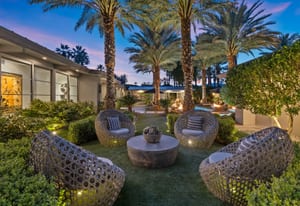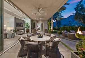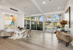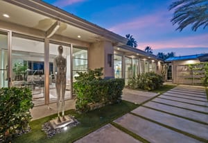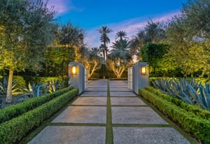 Premier south-facing 13th fairway location within the gates of Eldorado Country Club. This sensational property captures dramatic views of Mt. Eisenhower and a high level of seclusion. A gated entry, at the end of a quiet cul-de-sac, leads to immaculately landscaped grounds curated for both privacy and outdoor enjoyment. Remodeled down to the studs in 2018, the home presents striking contemporary architecture with clean lines, a neutral palette, and walls of glass that frame the impressive mountain backdrop. The great room showcases soaring vaulted ceilings, an elongated skylight, and a wood-burning fireplace, creating an open, light-filled living environment. A glass-enclosed office is positioned adjacent to the great room. Outdoor living areas are intentionally planned and include a courtyard pool patio with four fire bowls flanking the central walkway between the pool and a fountain reflection pool. The fairway patio is perimeter landscaped for privacy and highlights expansive views and a generous circular fire pit—ideal for entertaining or enjoying cool desert evenings. The gourmet kitchen is appointed with a center island, oversized walk-in pantry, and a sit-down bar counter adjacent to the formal dining area. The primary suite with fireplace features a dedicated office retreat, dual closets, and a spa-inspired bath opening to an outdoor shower. A gym, with bath, can easily be converted to a bedroom suite. The well-appointed guest house with kitchenette includes two spacious ensuite bedrooms, each with a sitting area. A pool cabana with living space, laundry room, and bathroom can also function as a private casita. This extraordinary residence brings together modern architectural design, privacy, and a prime fairway setting in one of Eldorado's most desirable locations.