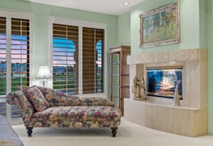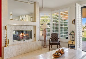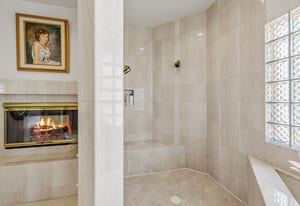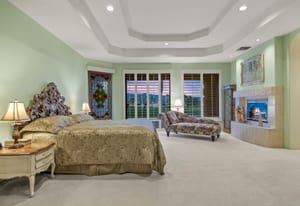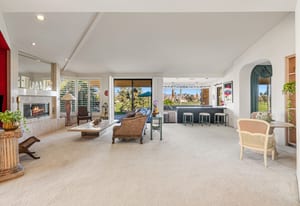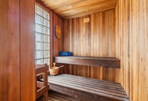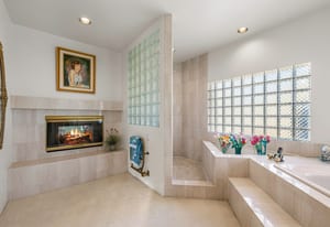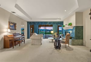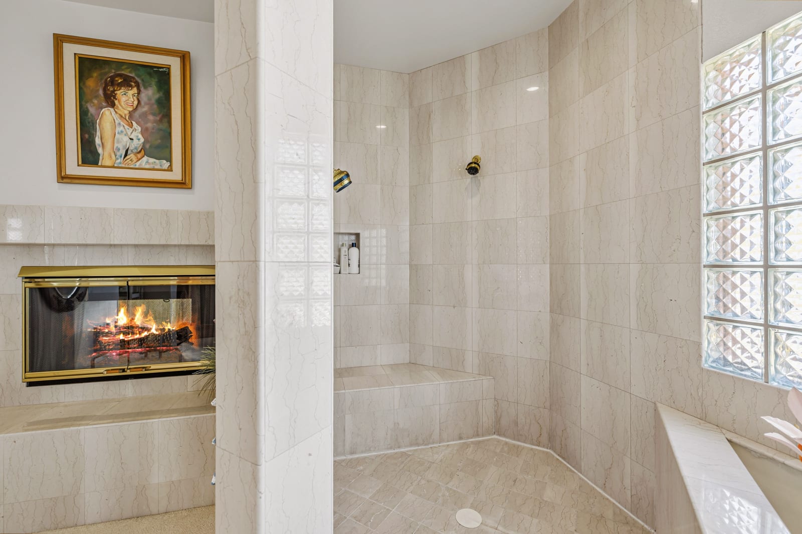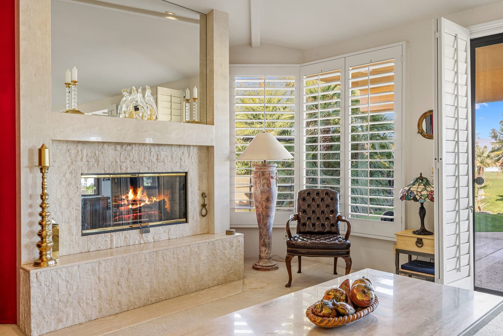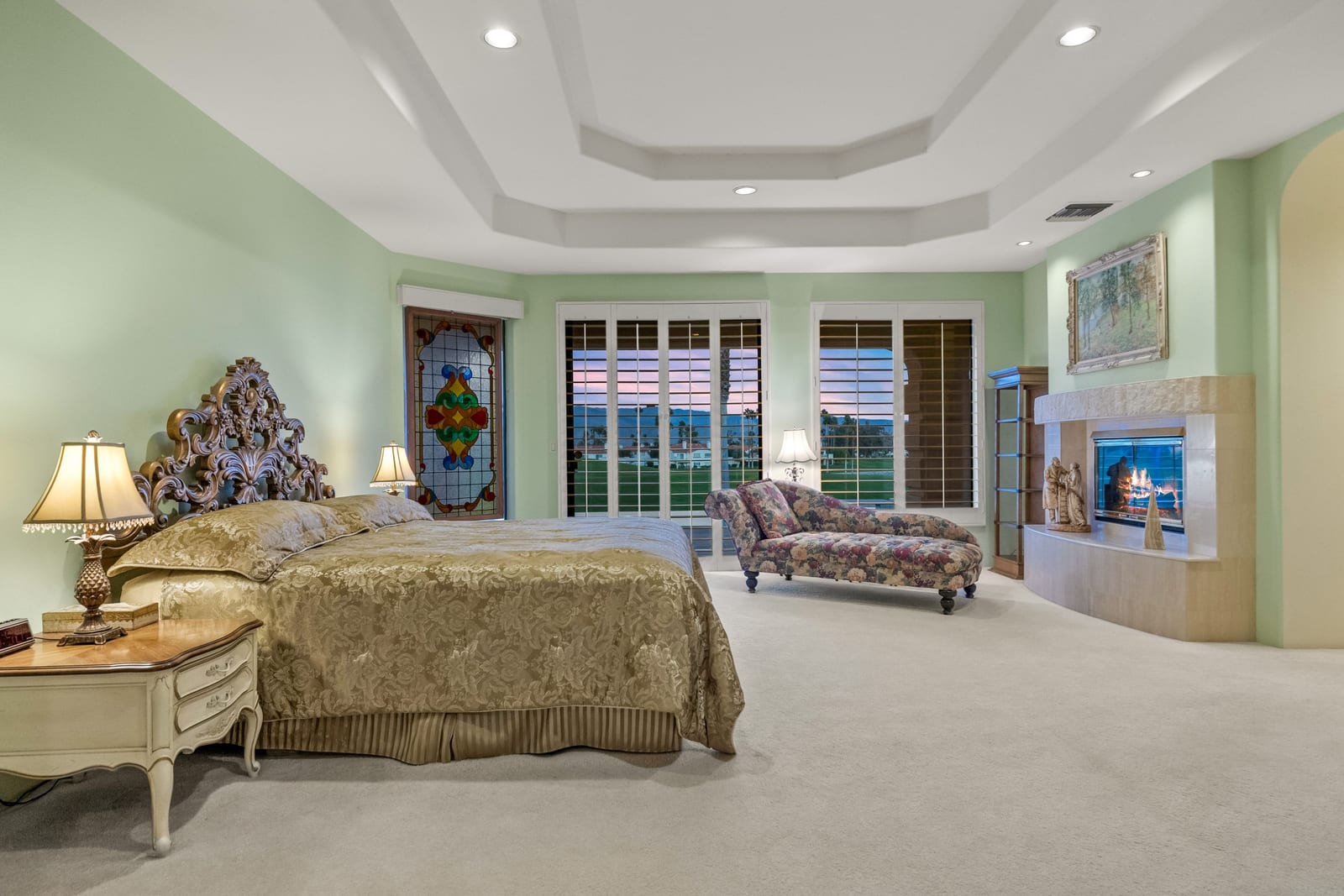 The grand primary suite is truly a retreat, with its own fireplace, direct pool and spa patio access, and luxurious spa-style bath featuring a fireplace, shower, soaking tub, and cedar-lined sauna, plus two large walk-in closets.