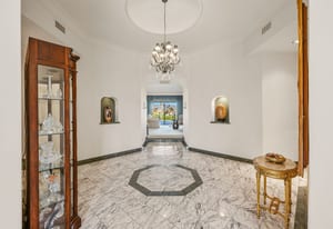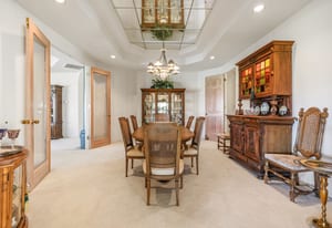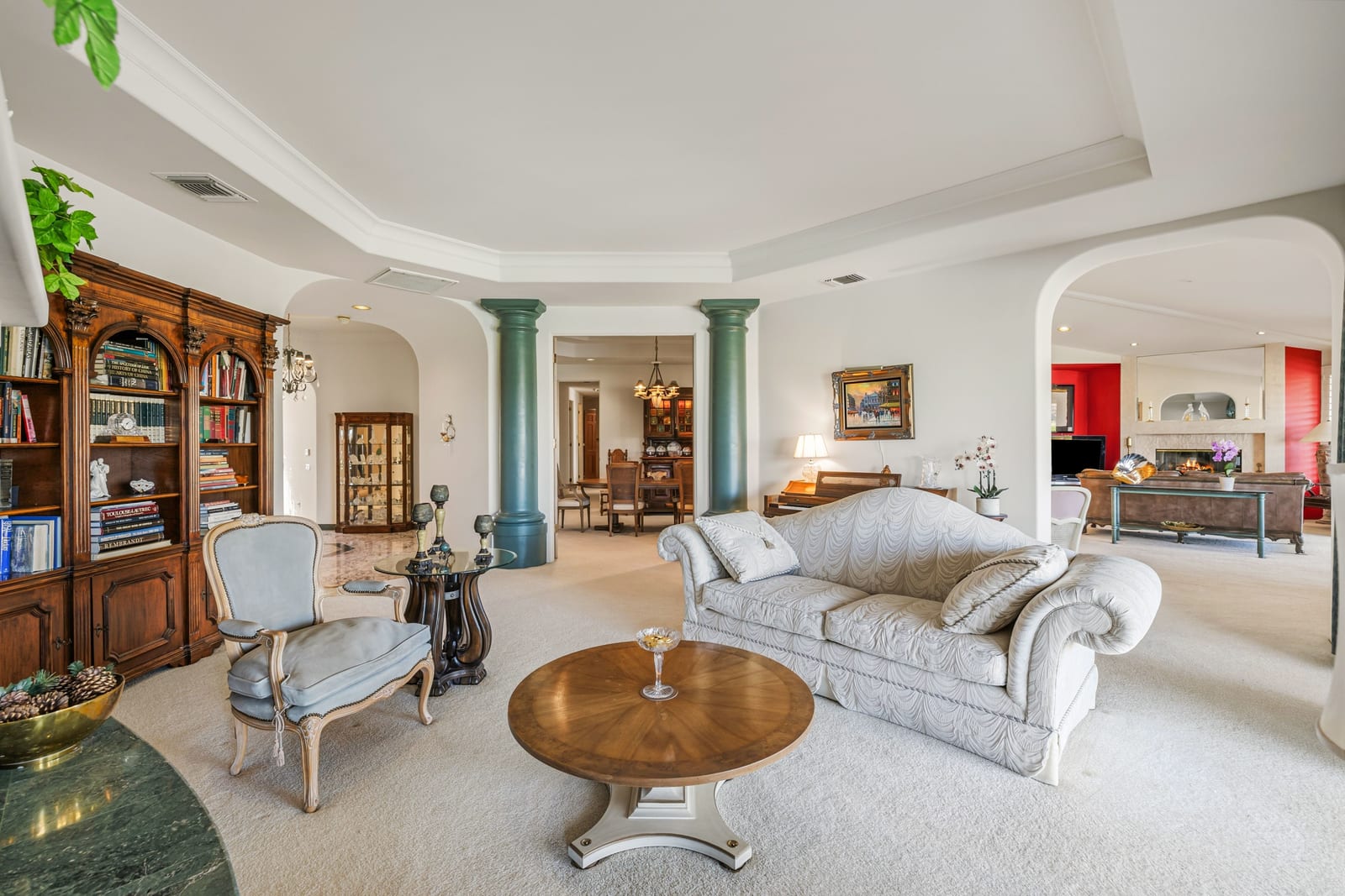 The formal living room features a marble fireplace, perfect for elegant gatherings, and opens to the patios, dining room, and family room. The family room boasts another fireplace and a wet bar, ideal for entertaining, while the formal dining room is perfect for holidays and special occasions.