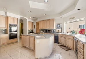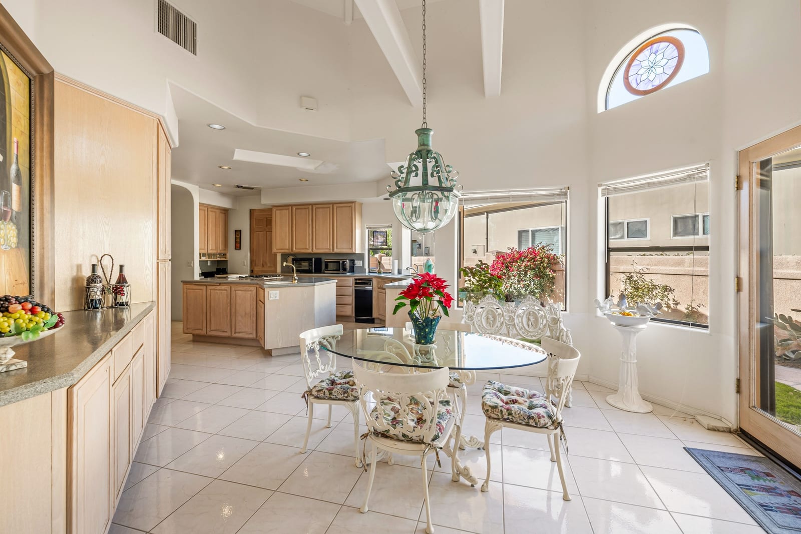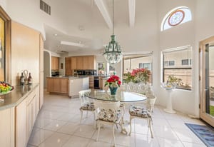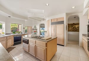 The spacious kitchen offers an island with sink, walk-in pantry, breakfast area, and direct access to patios and built-in BBQ—a chef’s and entertainer’s delight!