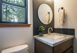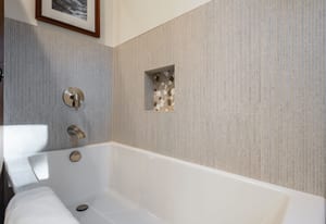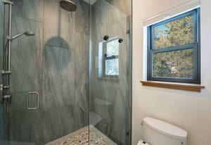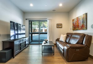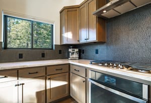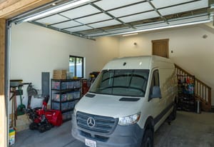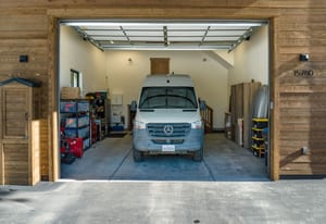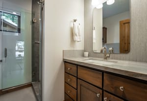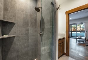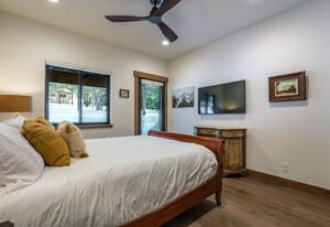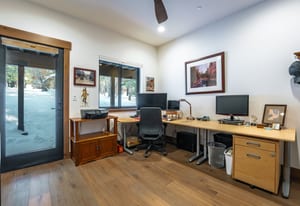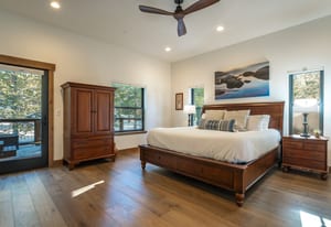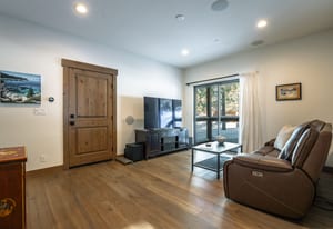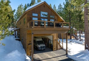 For Tahoe enthusiasts, the garage is a standout feature. Extra tall and fully finished, it includes a 12-foot insulated garage door designed to accommodate high-profile vehicles, camper vans, or roof-racked SUVs. Additional features include EV readiness, a utility sink, built-in speakers, and ample lighting. Behind the garage, a finished concrete-floor storage area provides approximately 240 square feet of additional space for gear.