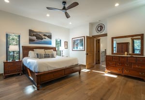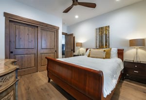 The main living space is designed for gathering after full days outdoors, anchored by a gas fireplace and enhanced by recessed lighting, automated Hunter Douglas window coverings, and wired multi-zone audio. The chef’s kitchen is both beautiful and functional, featuring GE Profile stainless steel appliances, quartzite countertops, a large island with seating and storage, an oversized sink, and a generous pantry—ideal for entertaining, holidays, or extended stays.