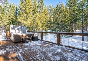 Outdoor living is equally dialed in. Cedar siding and decking with hogwire railings blend naturally into the forested setting, while multiple decks and a lower dry rear patio (with a water catchment system installed beneath the upper rear deck) offer space to relax, entertain, or unwind in the HotSpring Prodigy hot tub (purchased April 2025). Snow gates on the decks for easy snow removal, a flat southwest-facing driveway with generous parking, and underground power to the home all speak to year-round practicality. Gas and electrical connections on decks and patios further extend the home’s usability in every season.
