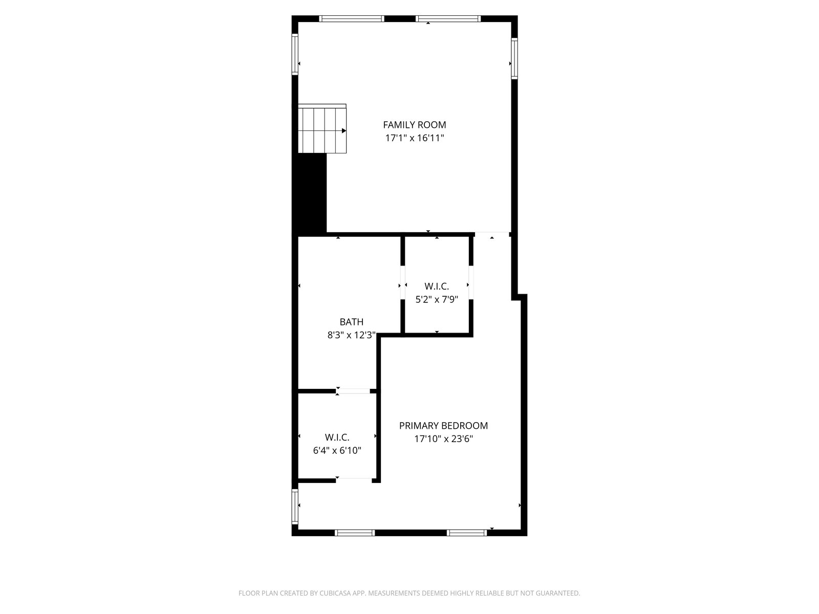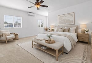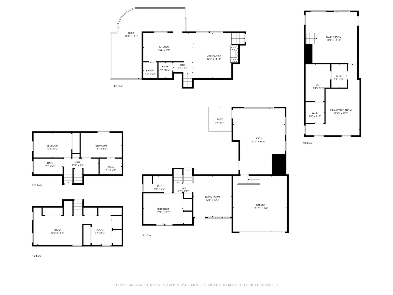 The expanded primary suite includes two walk-in closets and an updated bathroom with double vanity and a tiled walk-in shower. Additional bedrooms are positioned across levels for privacy and flexibility.