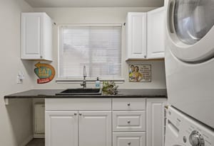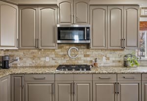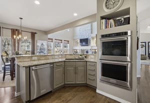 The kitchen is beautifully appointed with granite countertops, stainless steel appliances, double ovens, gas cooktop, dishwasher, and microwave — ideal for everyday living and hosting with ease. A main-floor utility room with cabinetry and sink adds convenience.