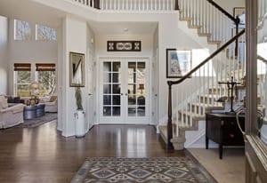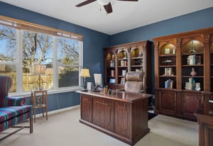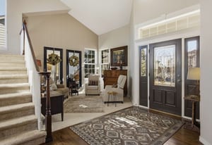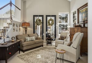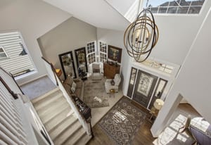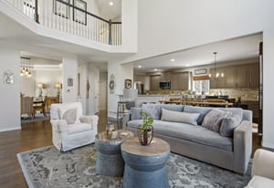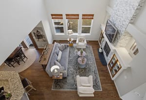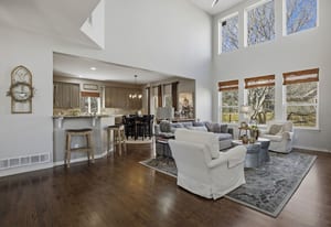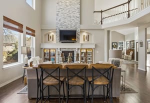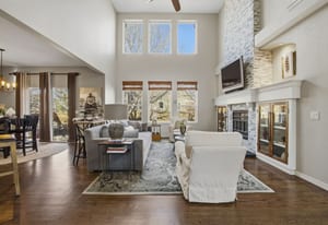 The dramatic two-story family room features a warm stone fireplace accented by built-in glass cabinets and a classic wood mantel — the perfect gathering place for relaxing evenings or entertaining guests.