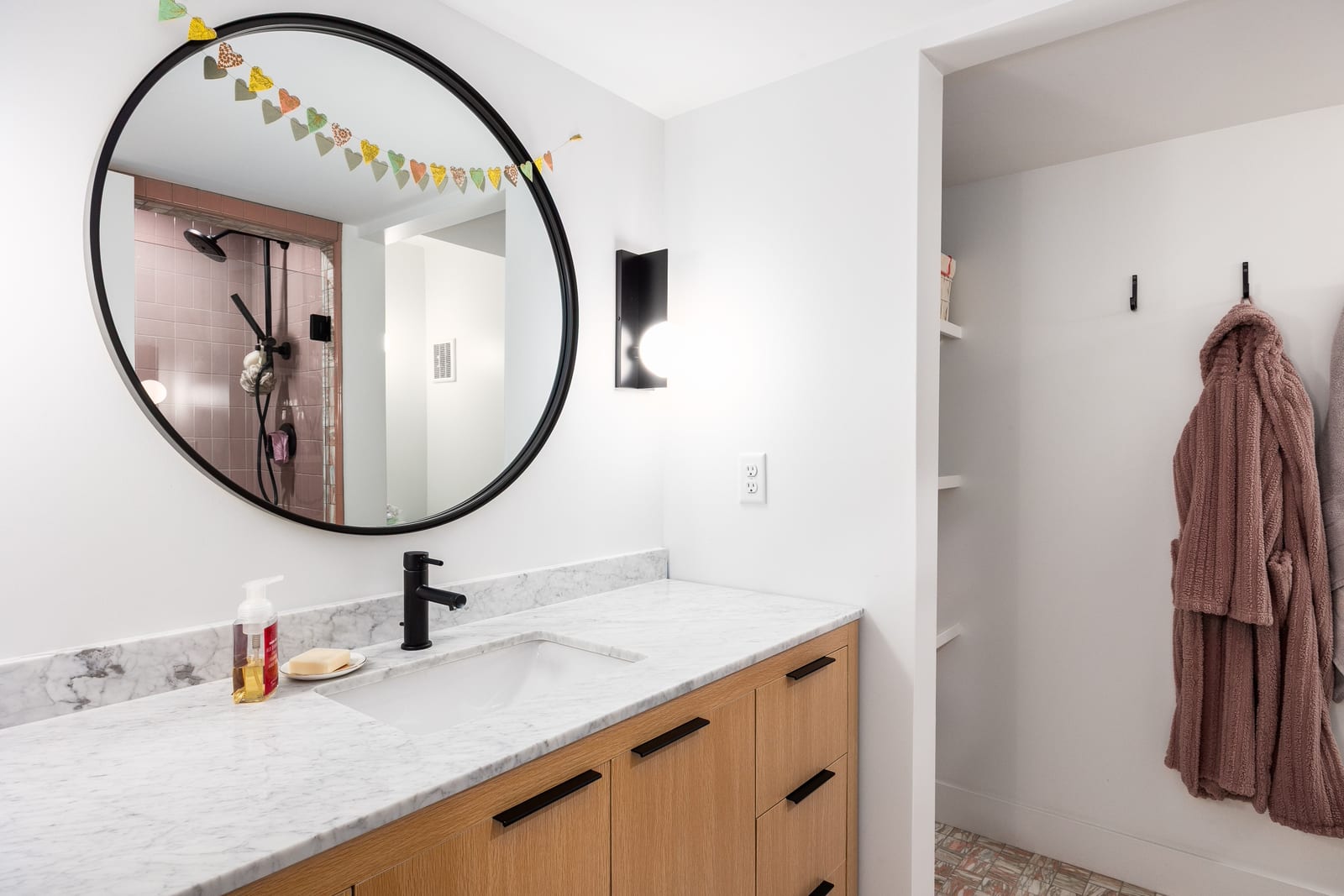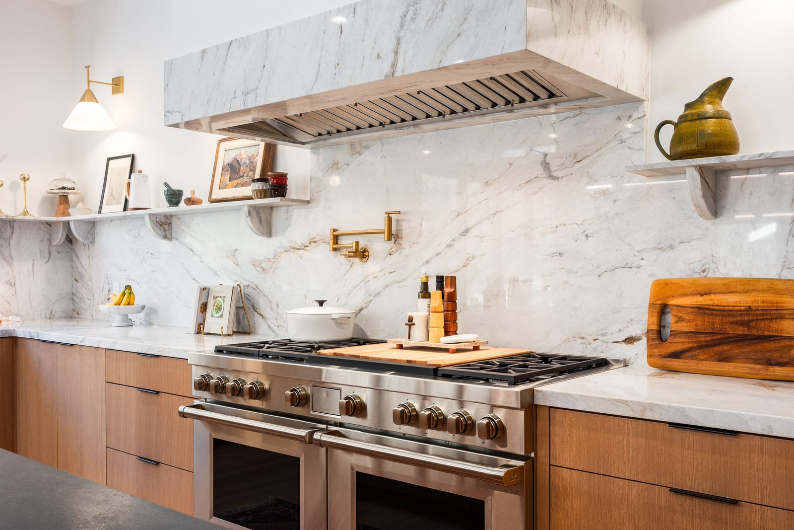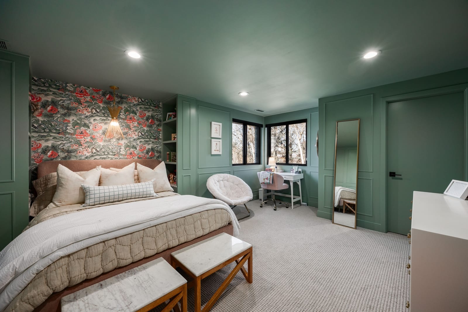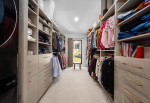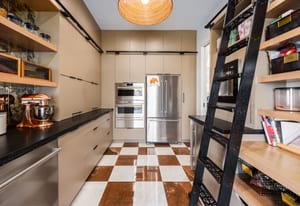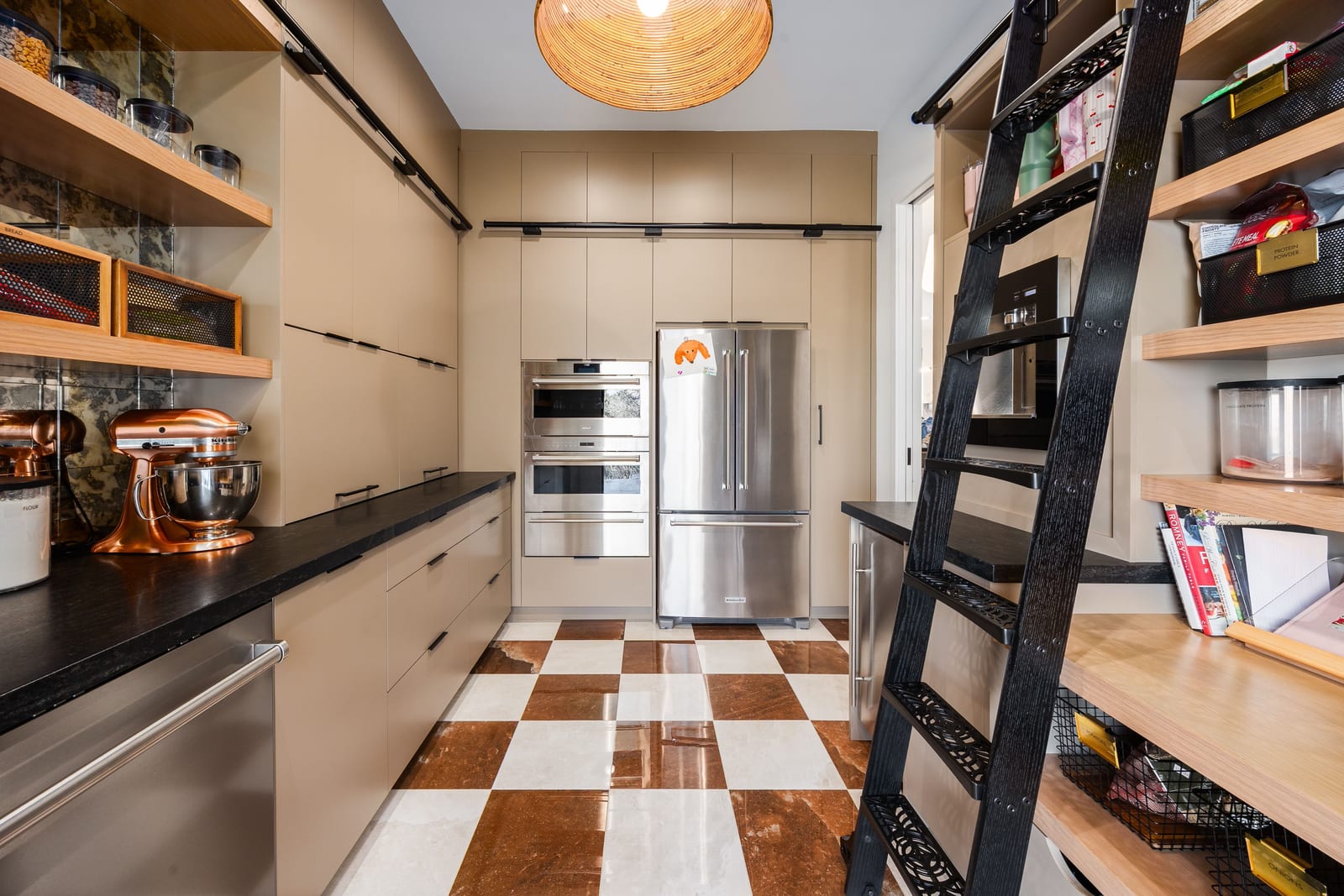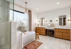 The formal living room showcases a dramatic two story bookcase and spiral staircase leading to a hidden book loft, while the solid slab fireplace makes it the perfect place to curl up with a good book. The luxurious owner’s suite feels like a personal retreat with custom millwork, a marble gas fireplace, vaulted ceilings, and expansive windows. The primary bathroom features an oversized double shower, freestanding tub, dual vanities including a makeup vanity, and a custom walk-in closet with integrated laundry.