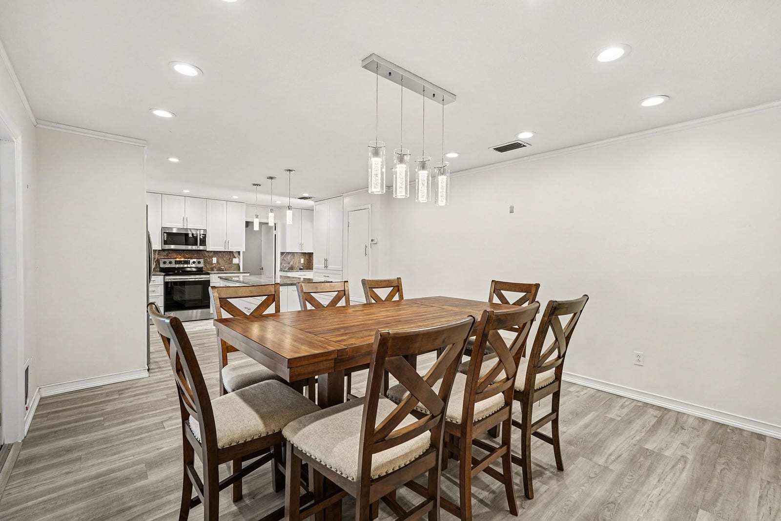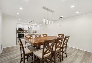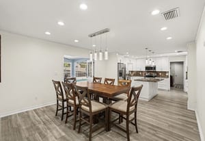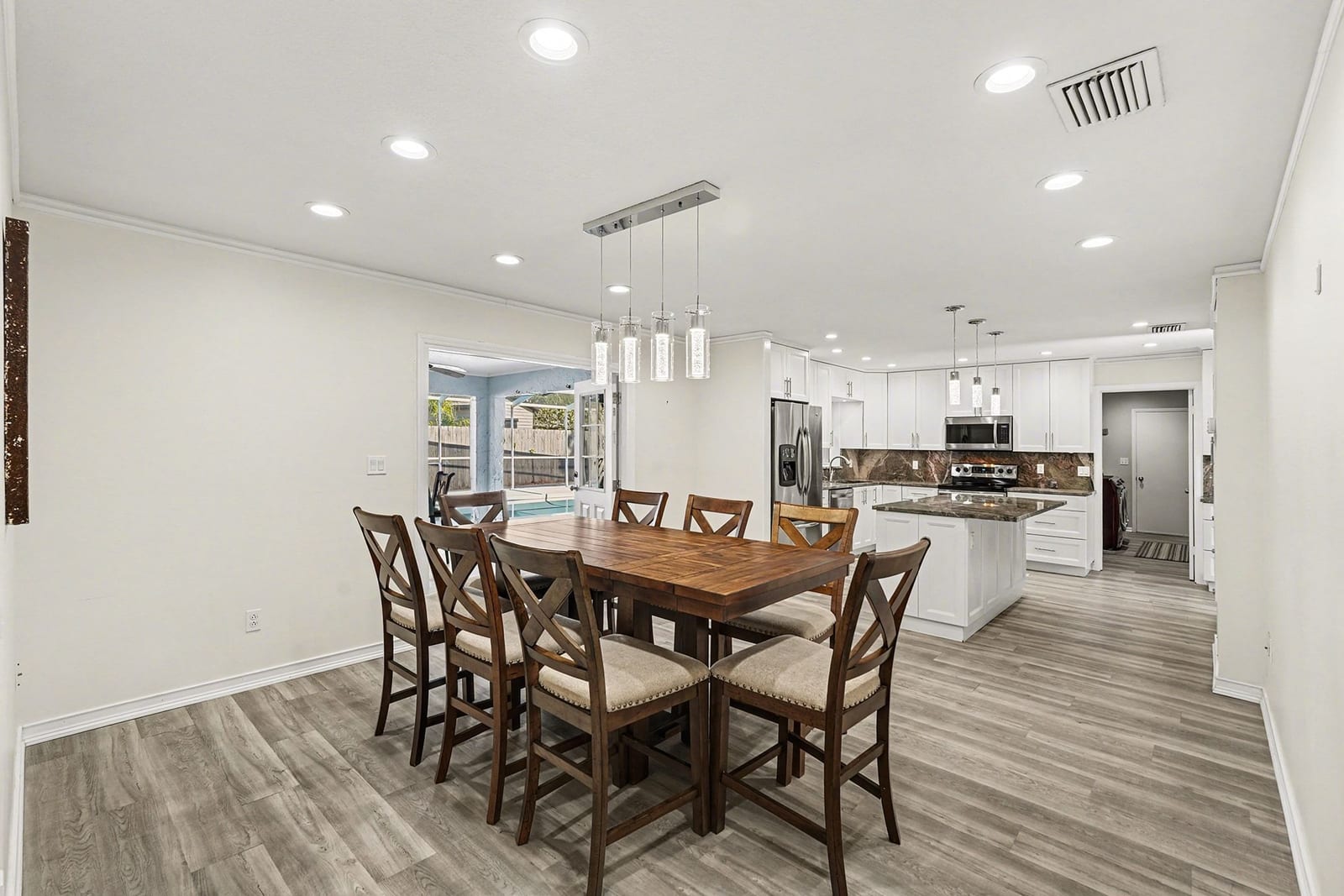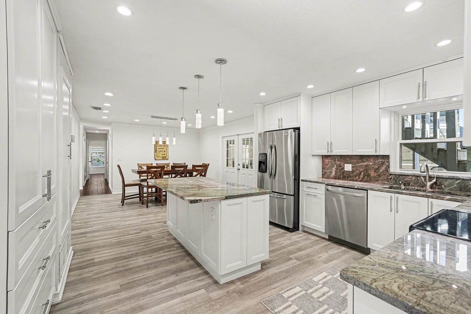 The Heart of the Home: Step inside to discover a freshly updated interior featuring durable luxury vinyl plank (LVP) flooring and multiple living areas designed for entertaining. The completely remodeled chef’s kitchen is a showstopper, boasting custom cabinetry, a massive built-in pantry, stainless steel appliances, and exquisite Quartzite countertops and backsplash. It is the perfect backdrop for holiday gatherings or quiet morning coffees.