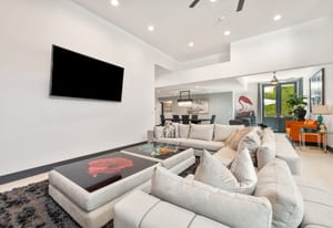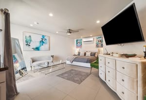 On the opposite side of the home, two elegant junior suites provide direct patio access, while a separate guest house with a full kitchen offers ideal accommodations for visitors.