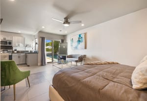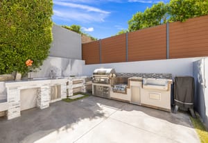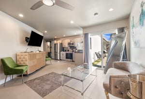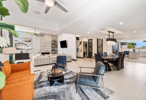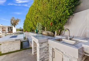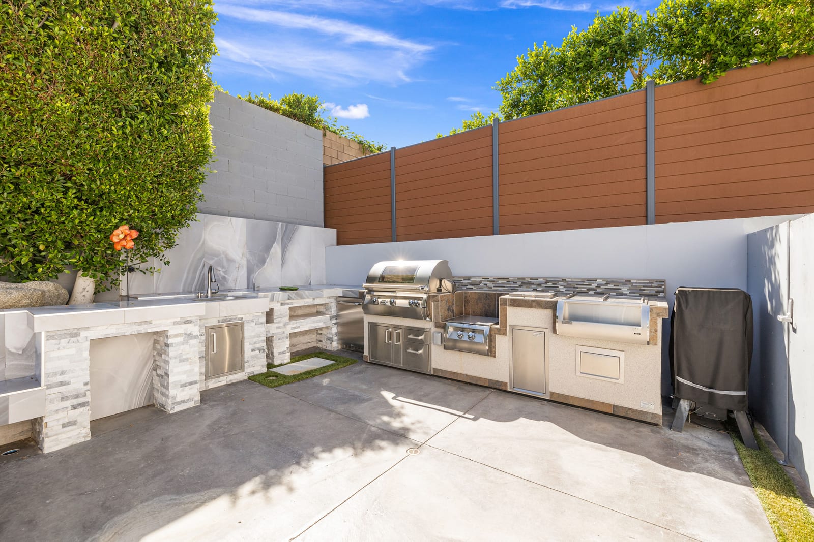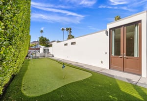 Designed for entertaining, the outdoor living space features a resort-style pool and spa, an outdoor kitchen, a putting green, and RV hookups—perfect for your own or guests' Airstream or RV.