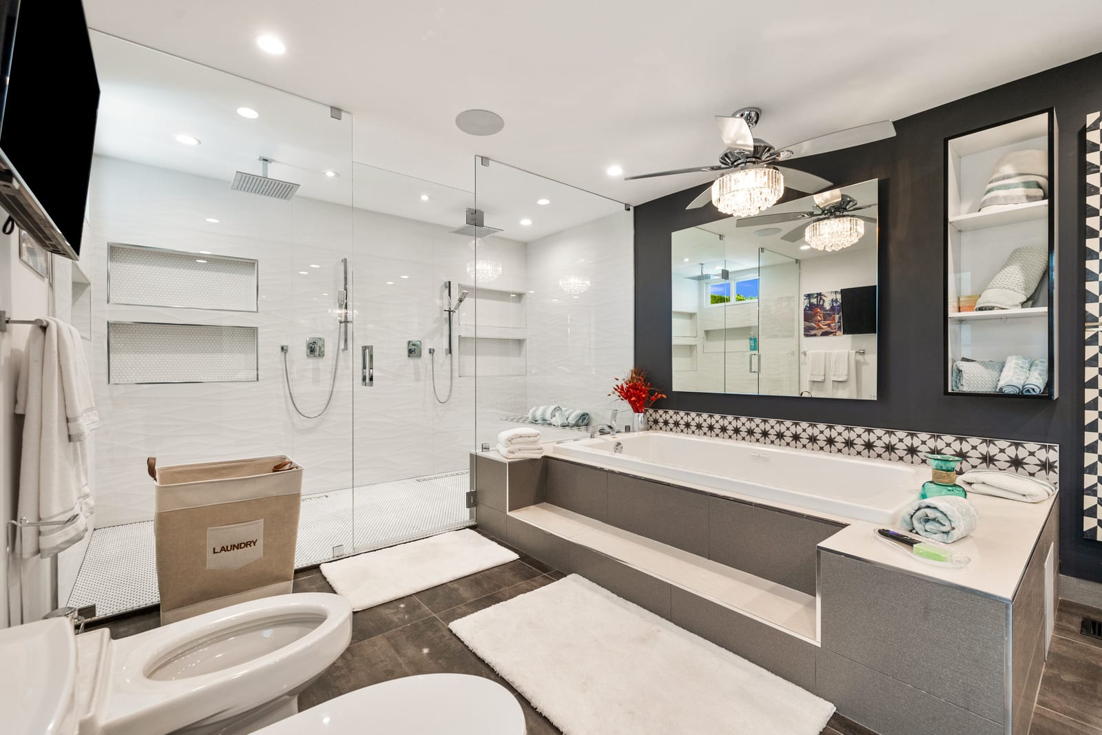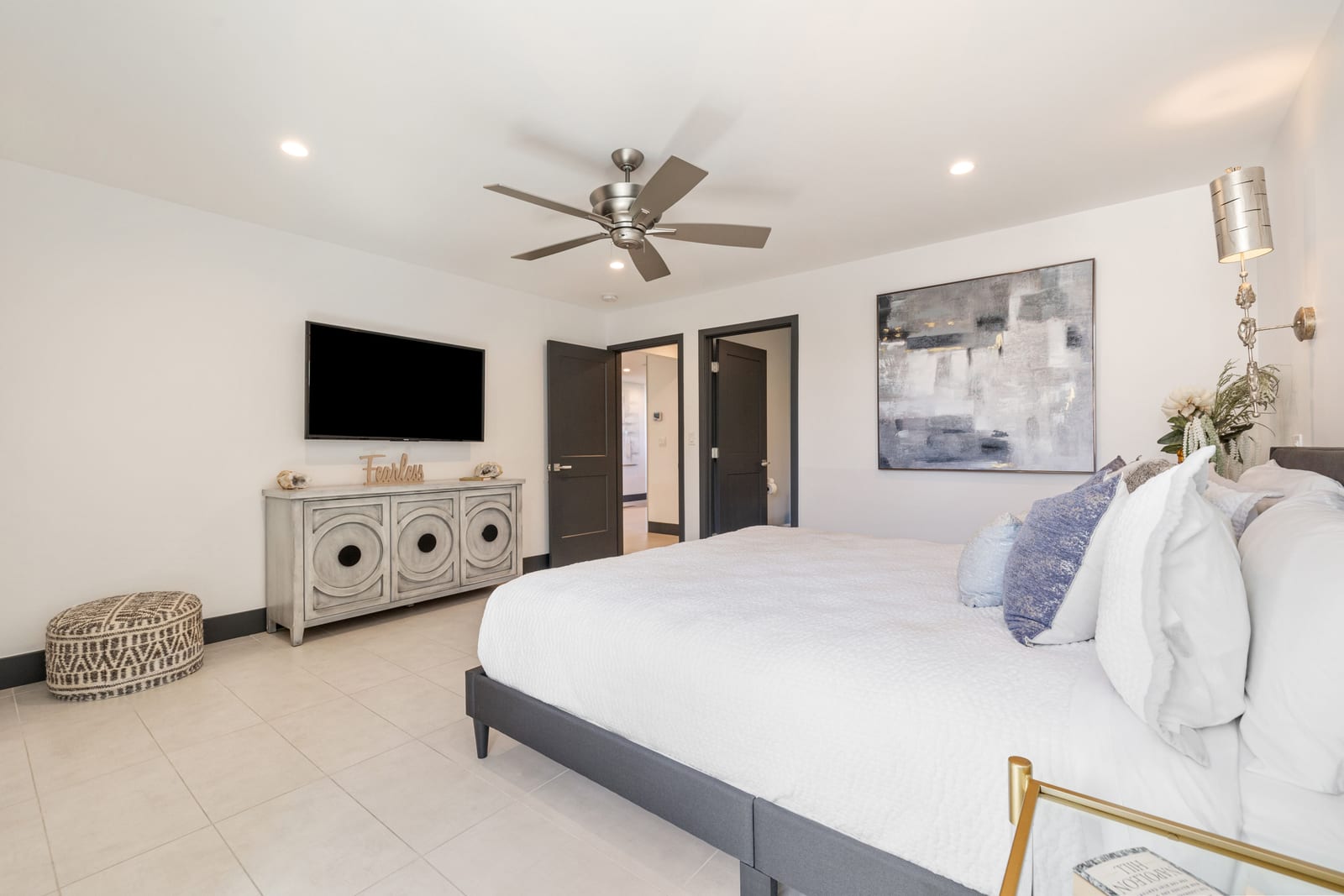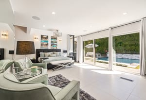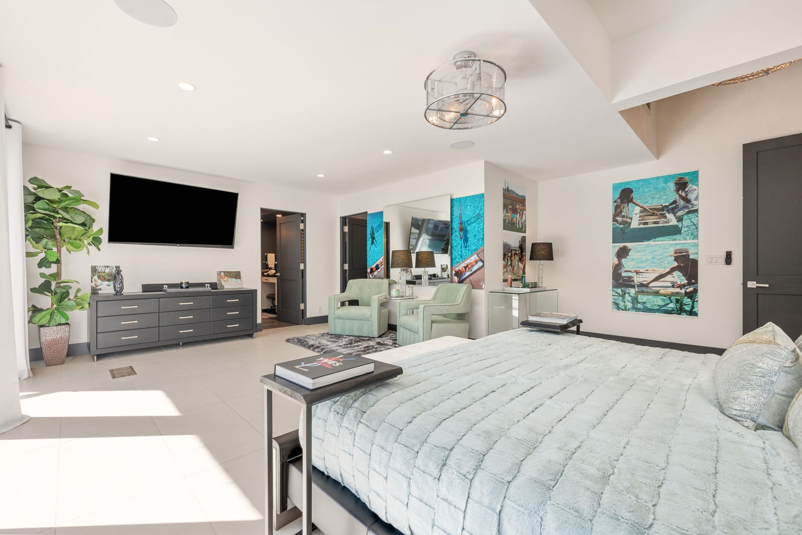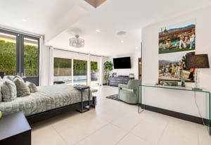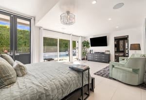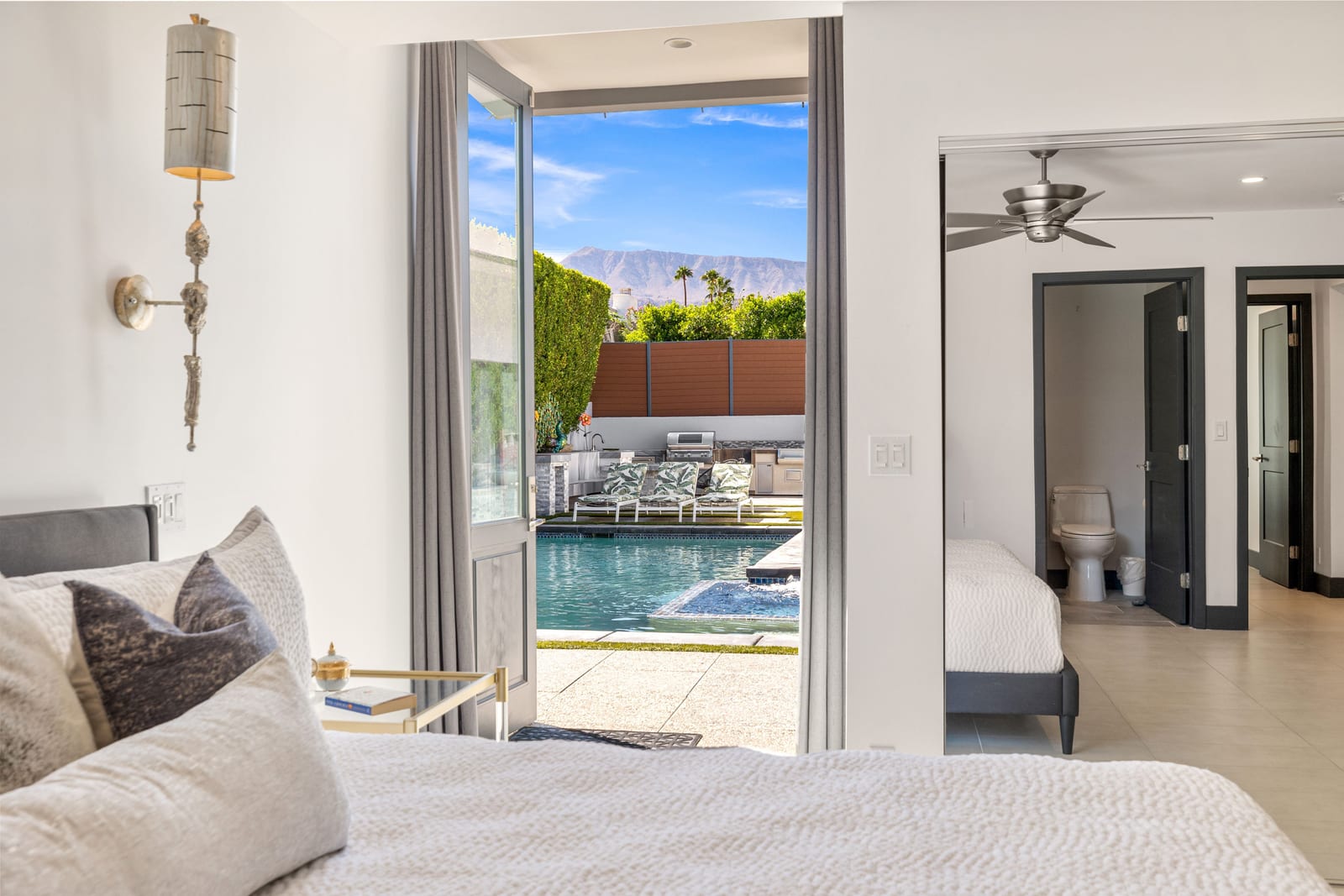 The luxurious primary suite is light-filled and spacious, showcasing a wall of glass overlooking the private pool and spa. The spa-inspired bath includes a dual shower, soaking tub, and a custom walk-in closet, delivering a true retreat experience.