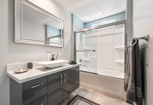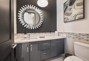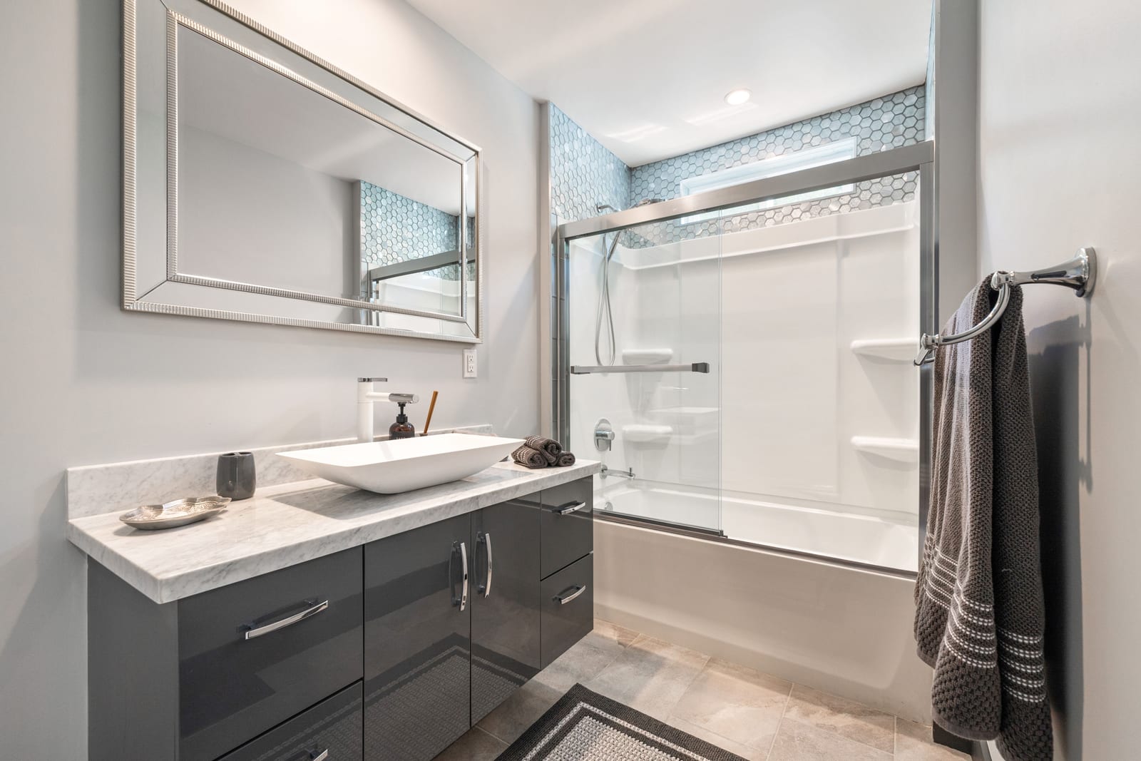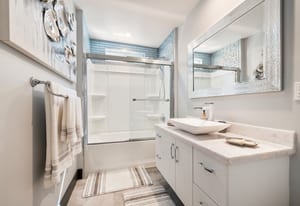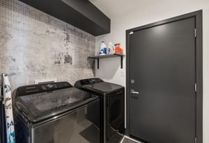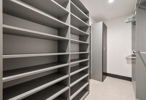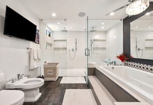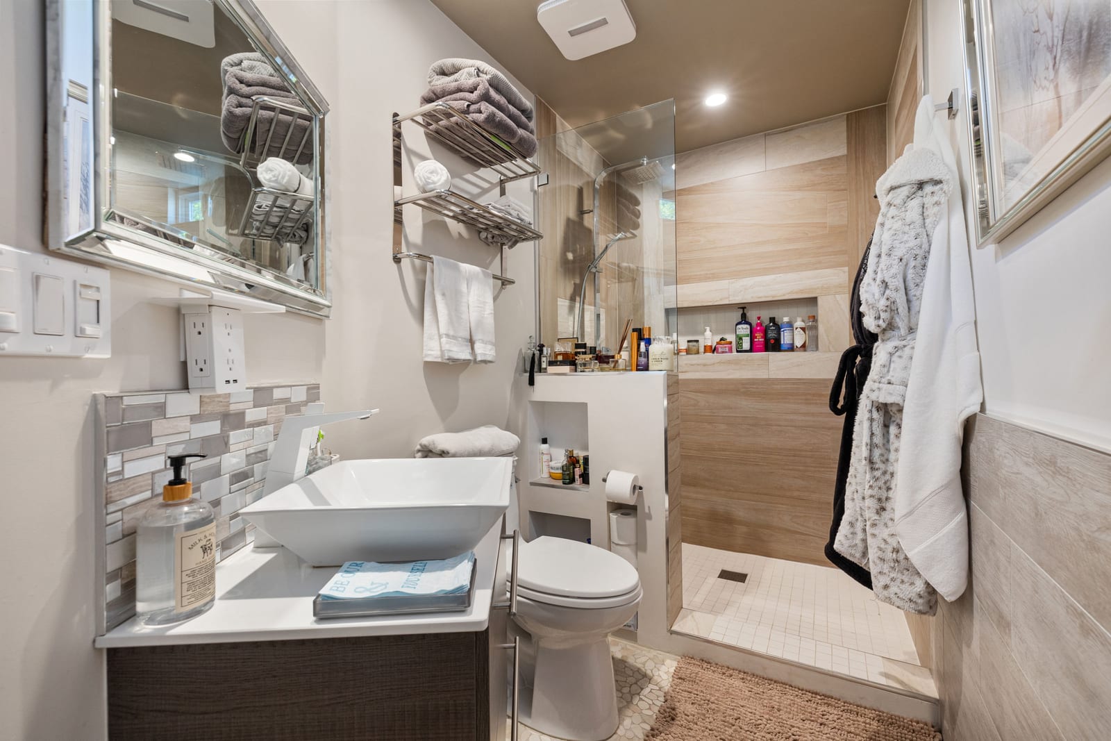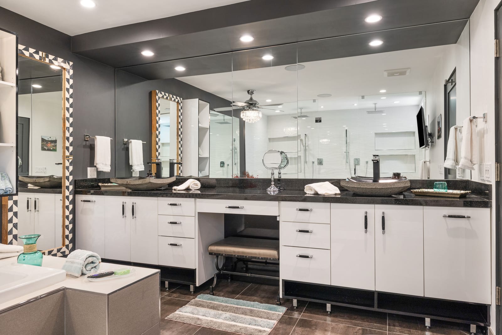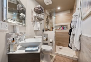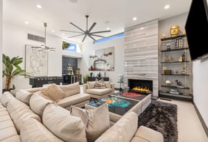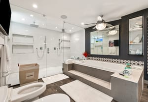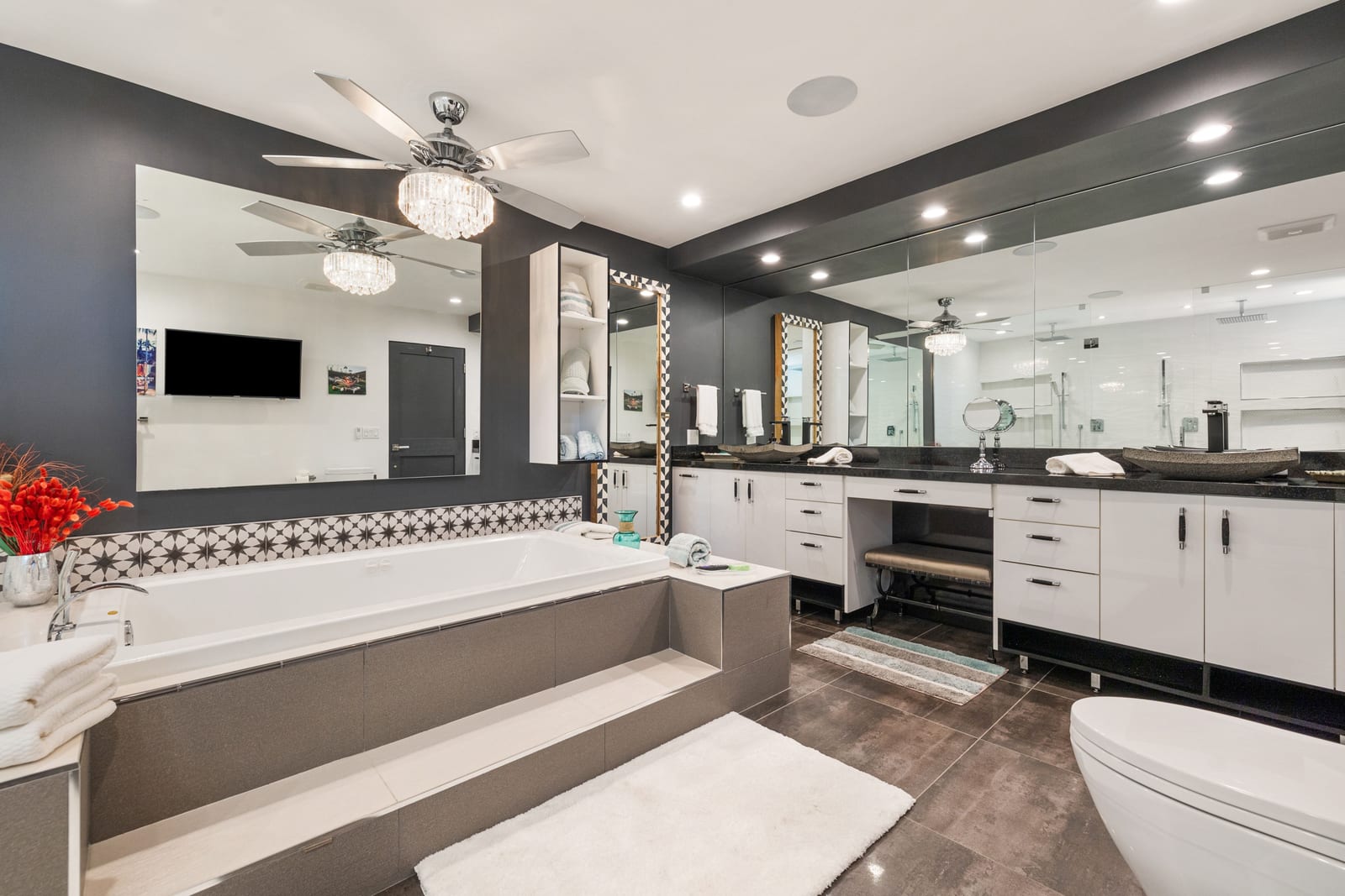 The luxurious primary suite is light-filled and spacious, showcasing a wall of glass overlooking the private pool and spa. The spa-inspired bath includes a dual shower, soaking tub, and a custom walk-in closet, delivering a true retreat experience.