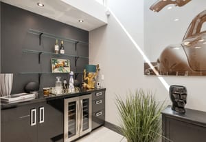 At the heart of the home is a custom chef's kitchen with breathtaking mountain views, featuring Wolf and Miele appliances, custom cabinets and finishes, a walk-in pantry, and a generous eat-in island—perfect for entertaining. The open living and dining areas offer a comfortable yet sophisticated atmosphere with a fireplace and wet bar.