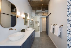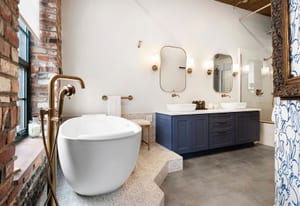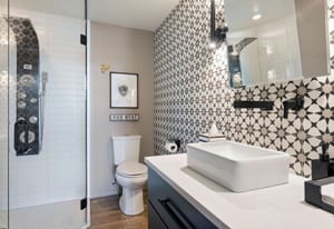 The primary suite offers a spa-inspired bath with a raised soaking tub, dual vanity with quartz countertops, Brizo Luxe Gold fixtures, towel-warming drawer, and an oversized shower with rainfall and body sprays. A Toto Neorest bidet toilet adds heated seating and auto-flush functionality. The secondary bath continues the spa experience with modern matte black finishes and a multi-function shower panel.