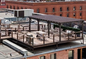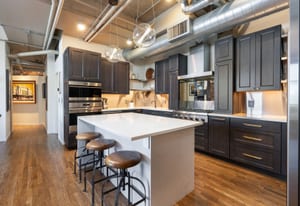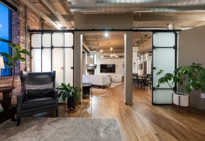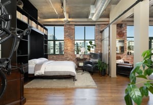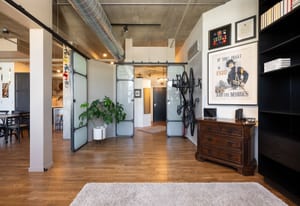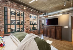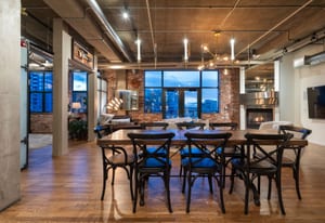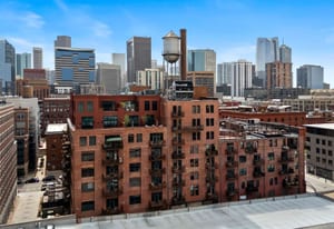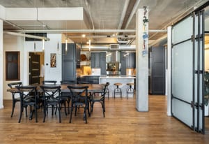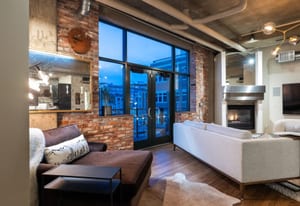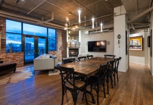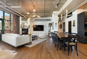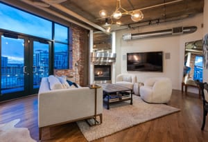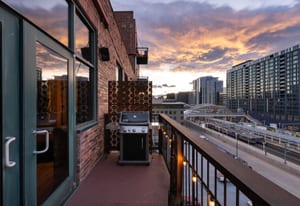 Open living and dining areas extend seamlessly to a private outdoor balcony with mountain views and Colorado sunsets—an exceptional amenity in a historic Denver loft.