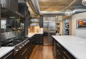 The chef’s kitchen is designed for both performance and presentation, featuring a Thermador six-burner gas range and hood, Sub-Zero refrigerator, Wolf oven, Cove dishwasher, and built-in wine refrigerator, complemented by a stainless-steel backsplash, open shelving, and custom cabinetry.