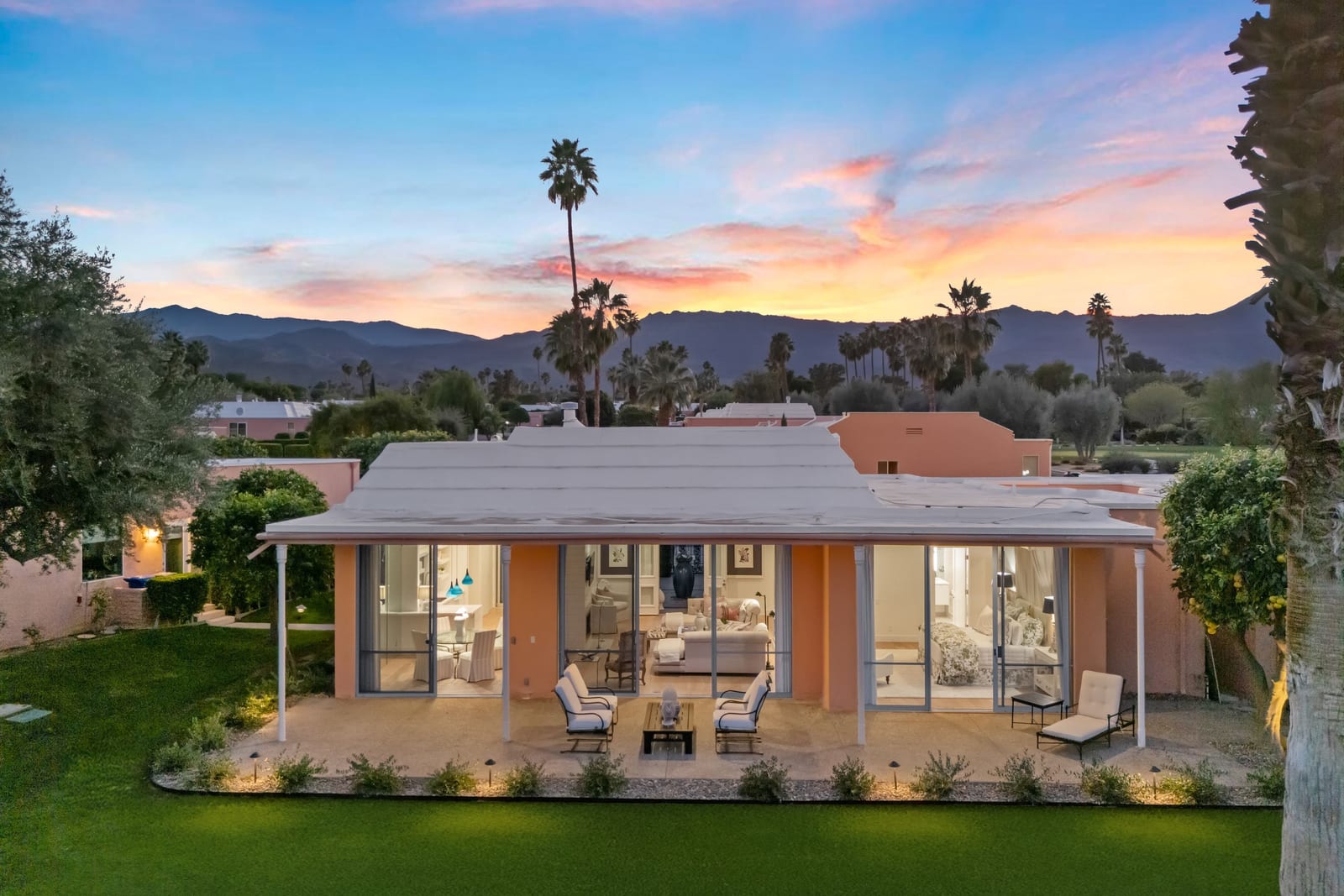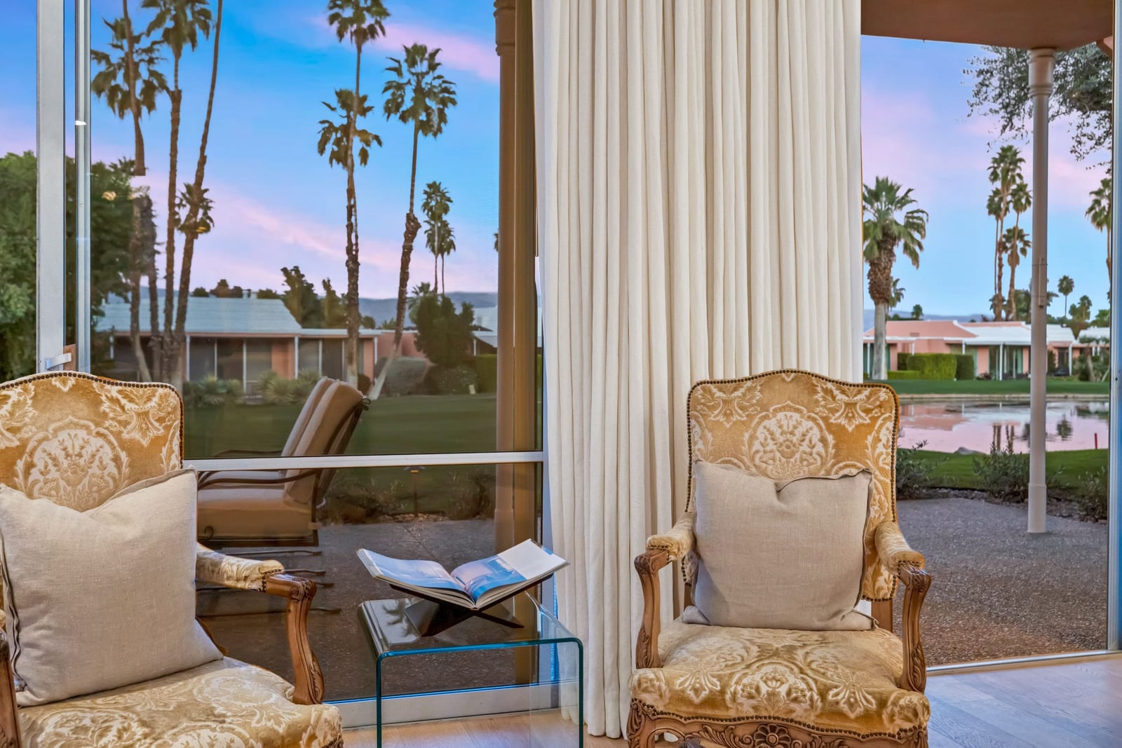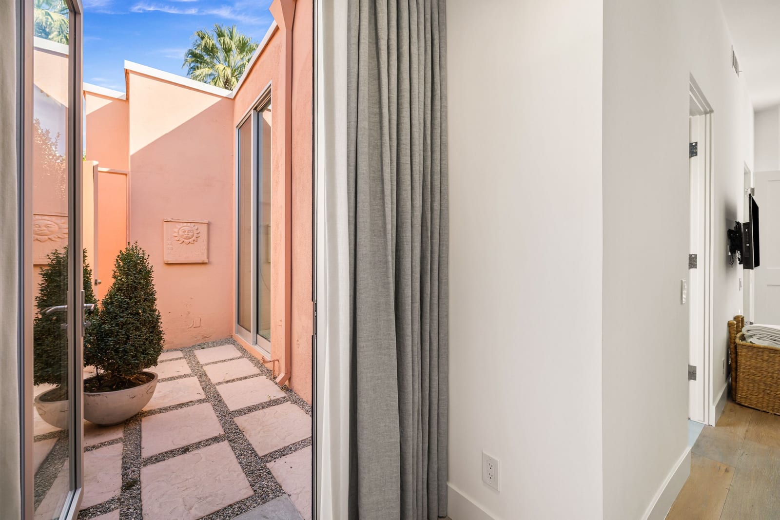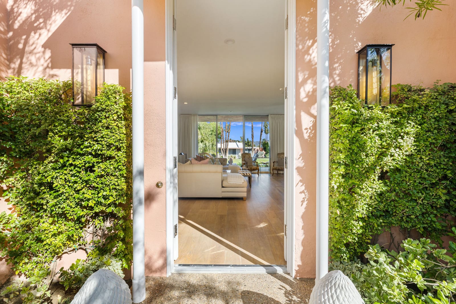 Situated in prestigious Marrakesh Country Club, this John Elgin Woolf-designed Hollywood Regency villa is a masterful blend of modern and classic luxury. Enter through wrought-iron gates into the expansive south-facing courtyard, beautifully landscaped in timeless style, and step inside through the iconic Marrakesh Pullman entry doors. This two-bedroom, three-bathroom, 1,910 sq. ft. B Plan has been thoughtfully reimagined with exceptional attention to detail, seamlessly combining bright, modern aesthetics with timeless sophistication.