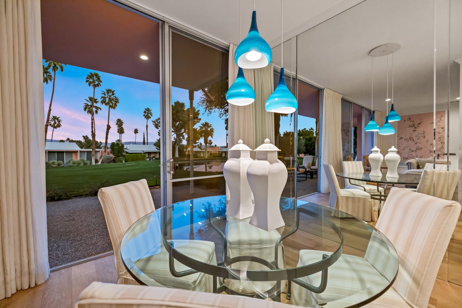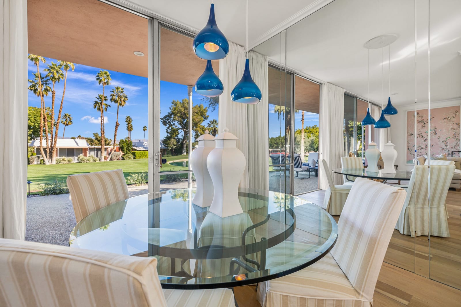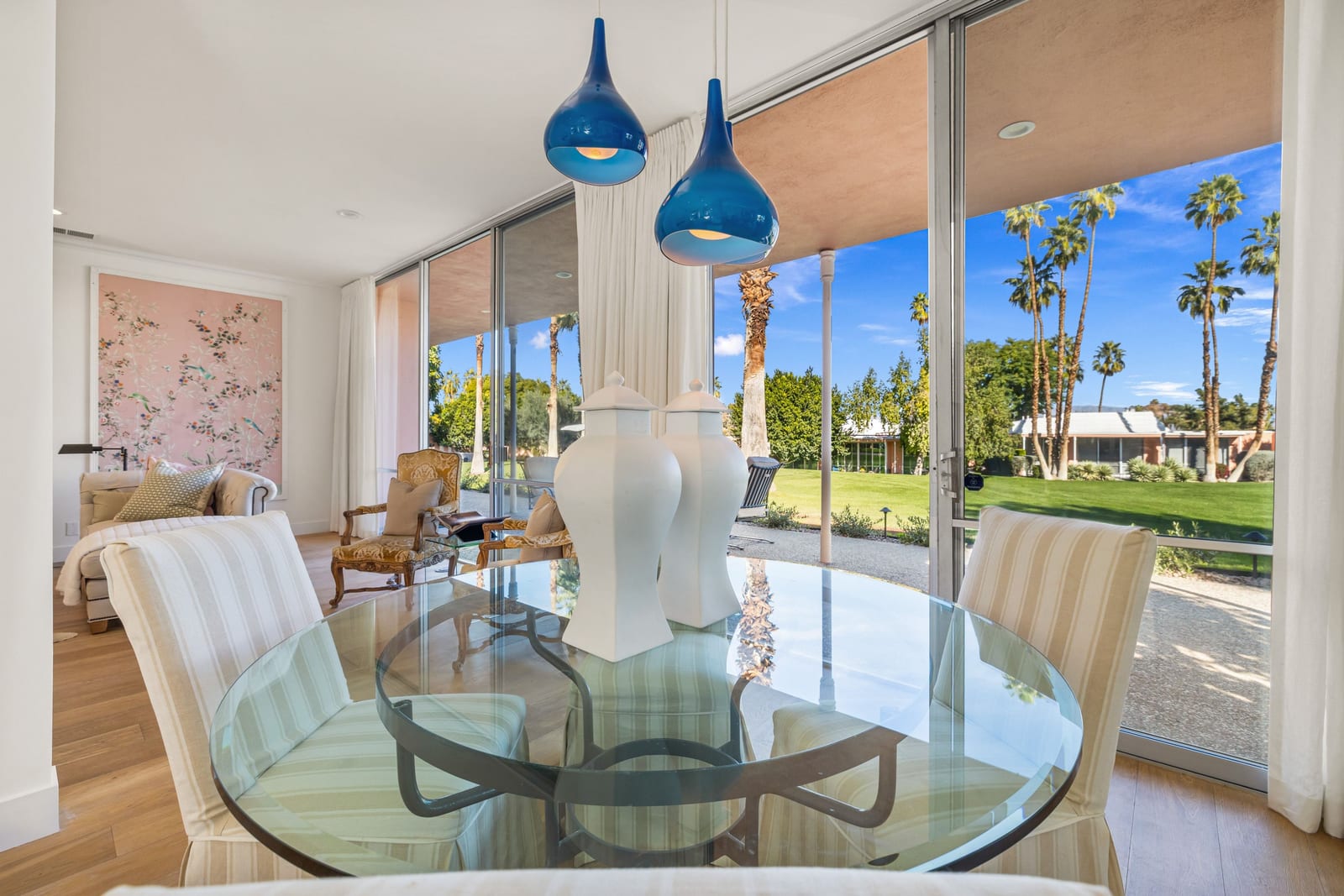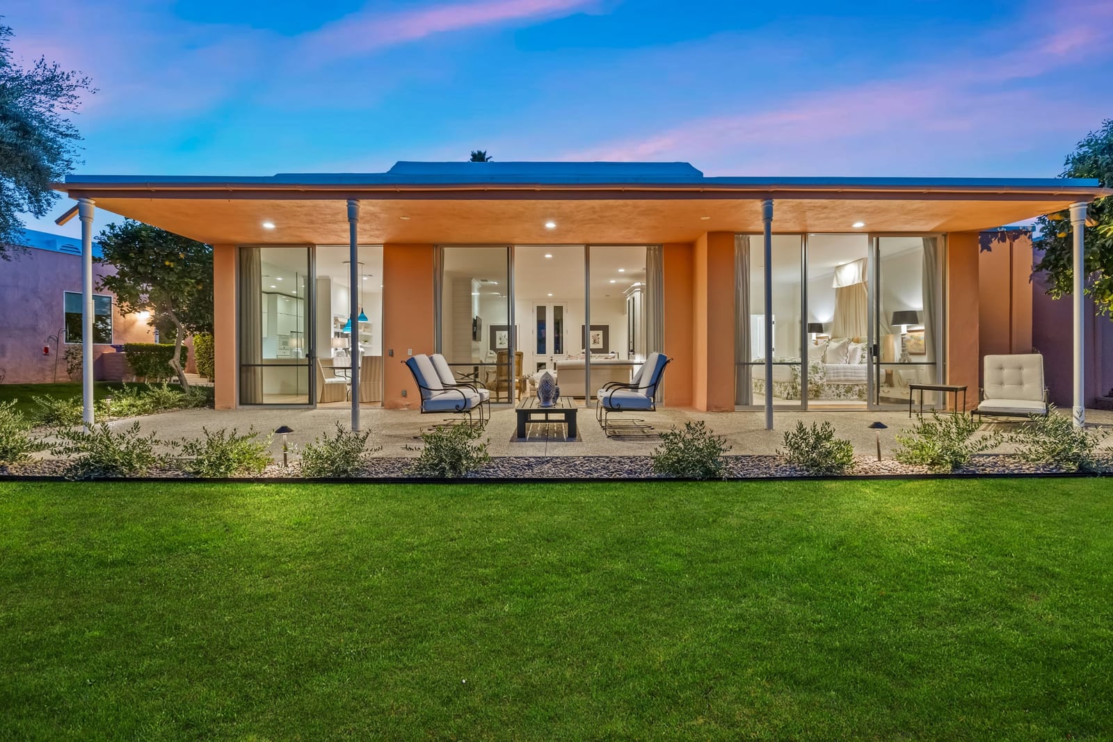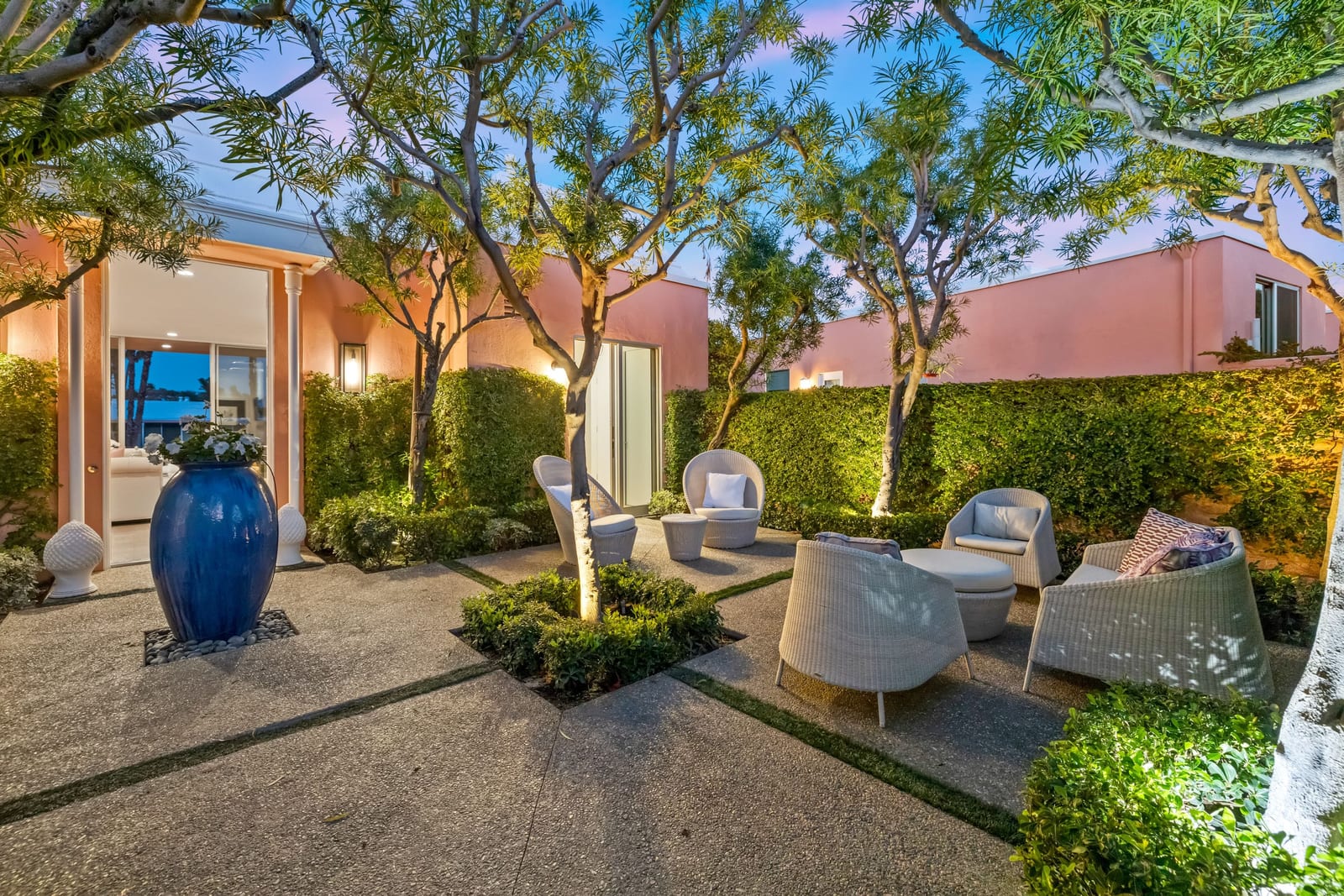 Situated in prestigious Marrakesh Country Club, this John Elgin Woolf-designed Hollywood Regency villa is a masterful blend of modern and classic luxury. Enter through wrought-iron gates into the expansive south-facing courtyard, beautifully landscaped in timeless style, and step inside through the iconic Marrakesh Pullman entry doors. This two-bedroom, three-bathroom, 1,910 sq. ft. B Plan has been thoughtfully reimagined with exceptional attention to detail, seamlessly combining bright, modern aesthetics with timeless sophistication.