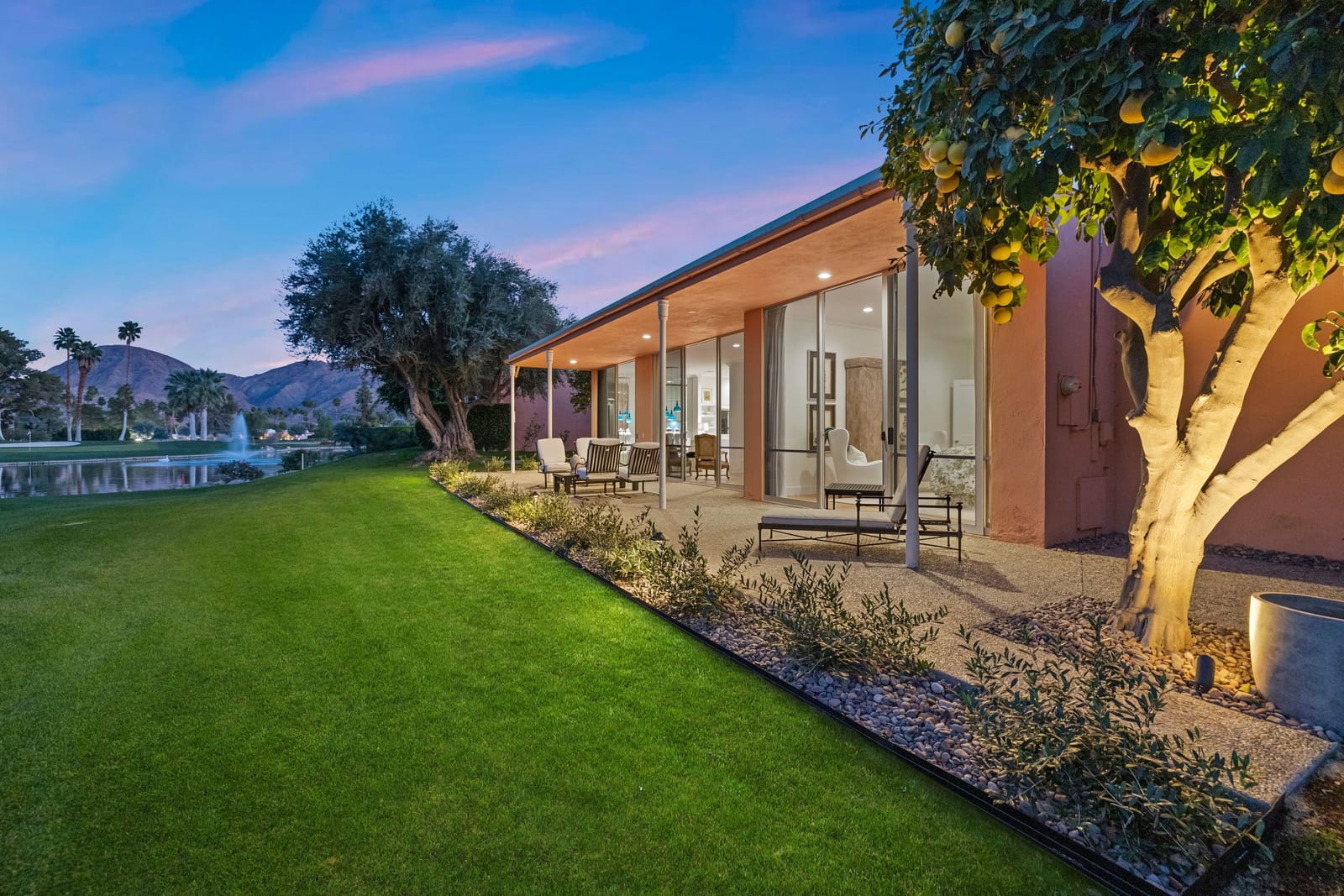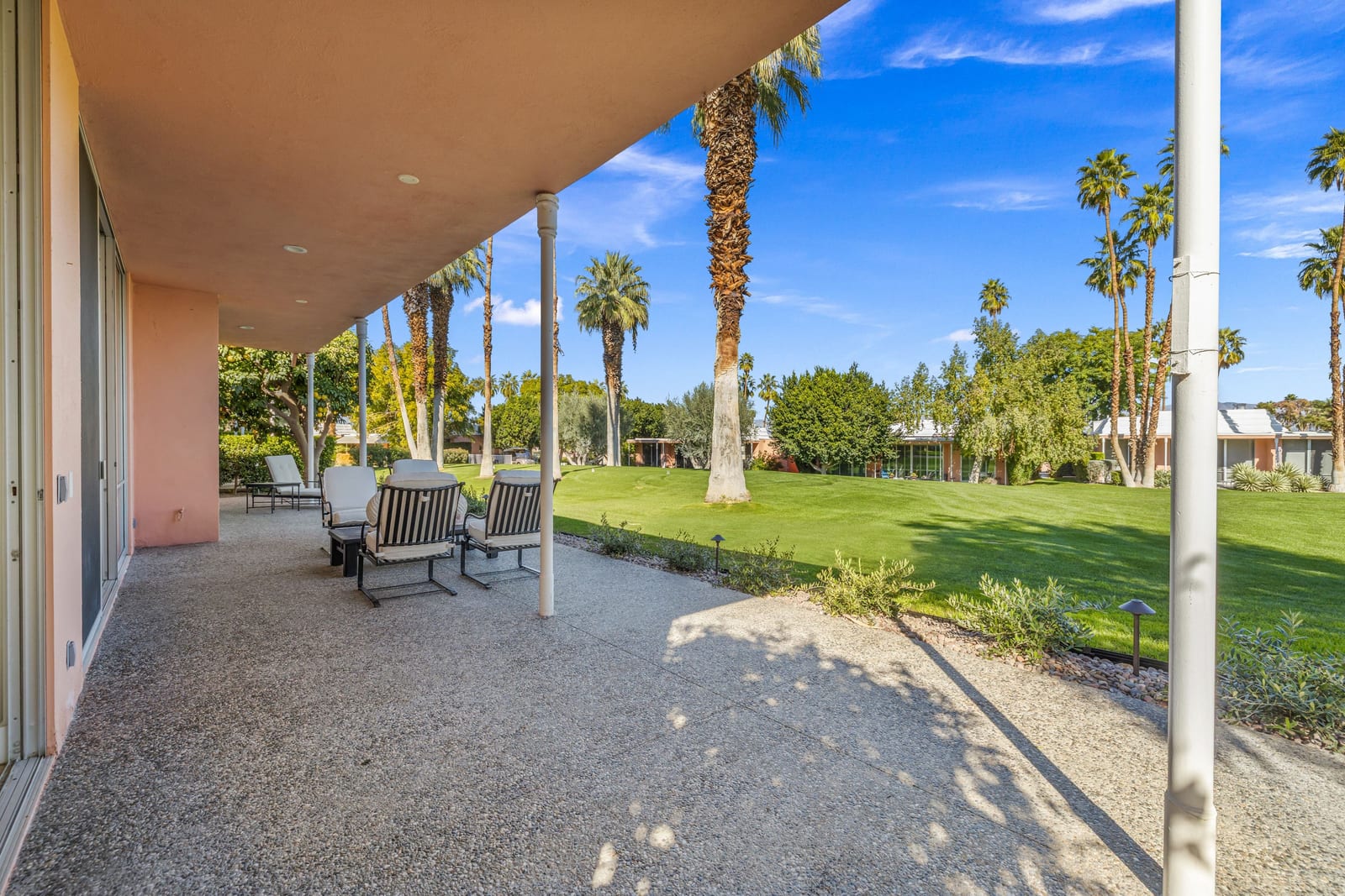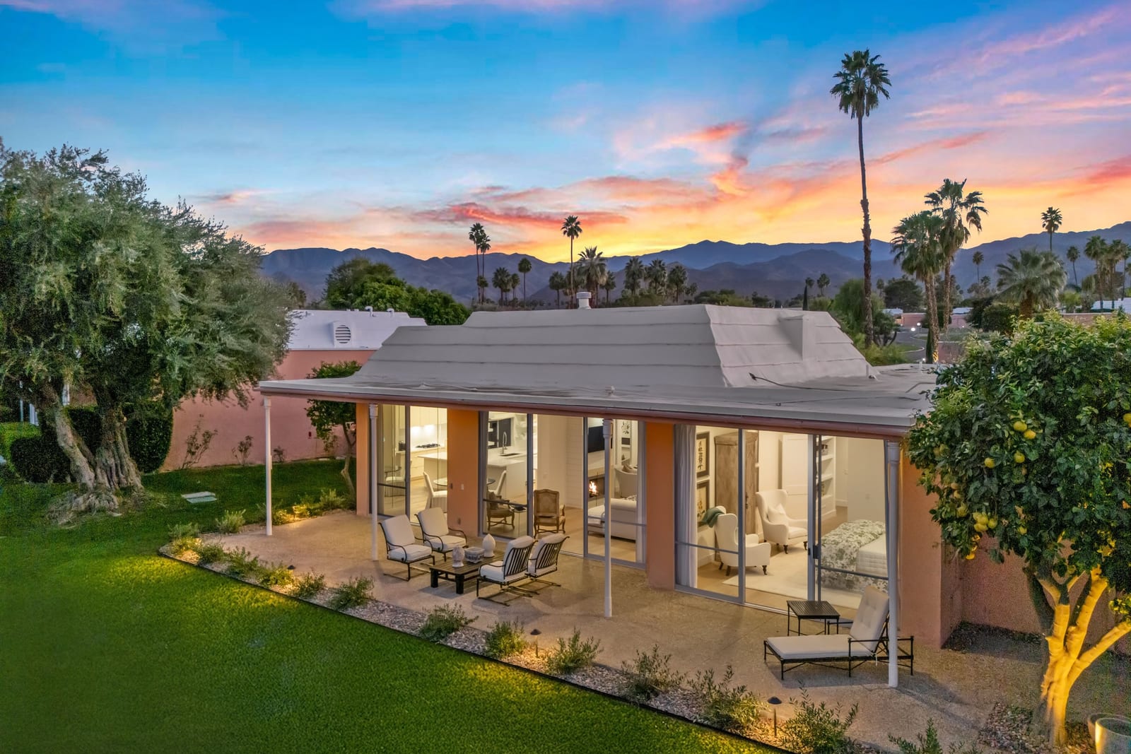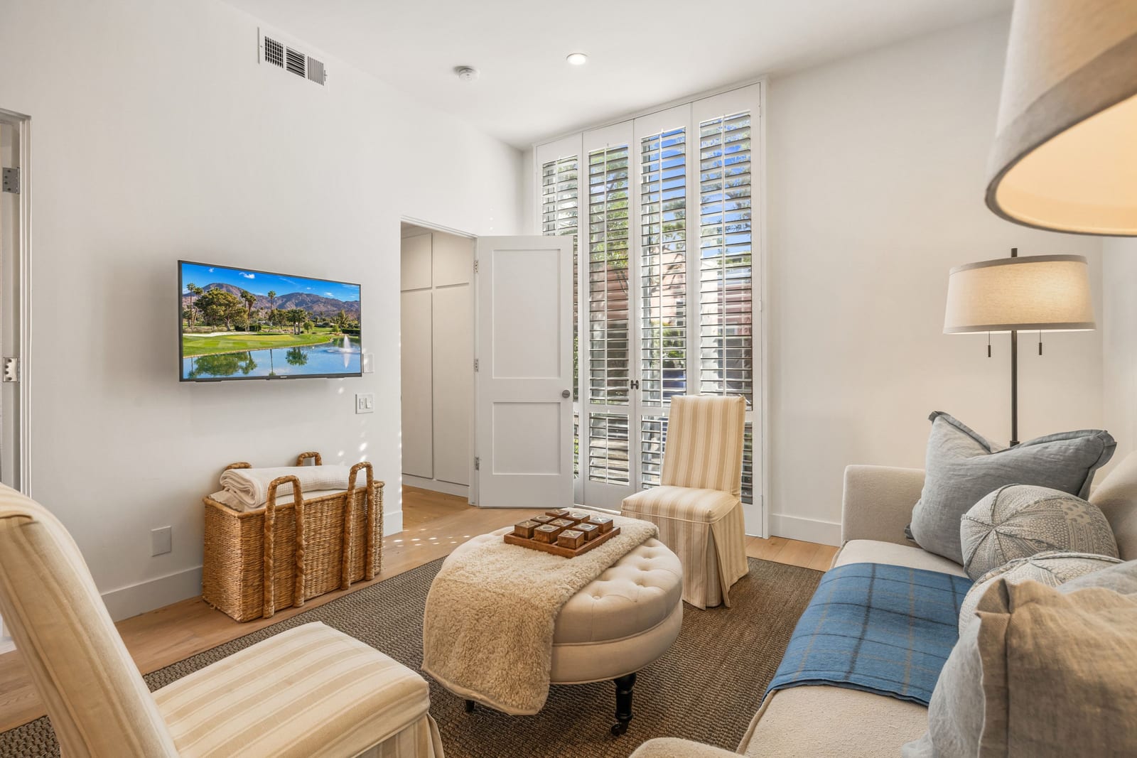 Situated in prestigious Marrakesh Country Club, this John Elgin Woolf-designed Hollywood Regency villa is a masterful blend of modern and classic luxury. Enter through wrought-iron gates into the expansive south-facing courtyard, beautifully landscaped in timeless style, and step inside through the iconic Marrakesh Pullman entry doors. This two-bedroom, three-bathroom, 1,910 sq. ft. B Plan has been thoughtfully reimagined with exceptional attention to detail, seamlessly combining bright, modern aesthetics with timeless sophistication.