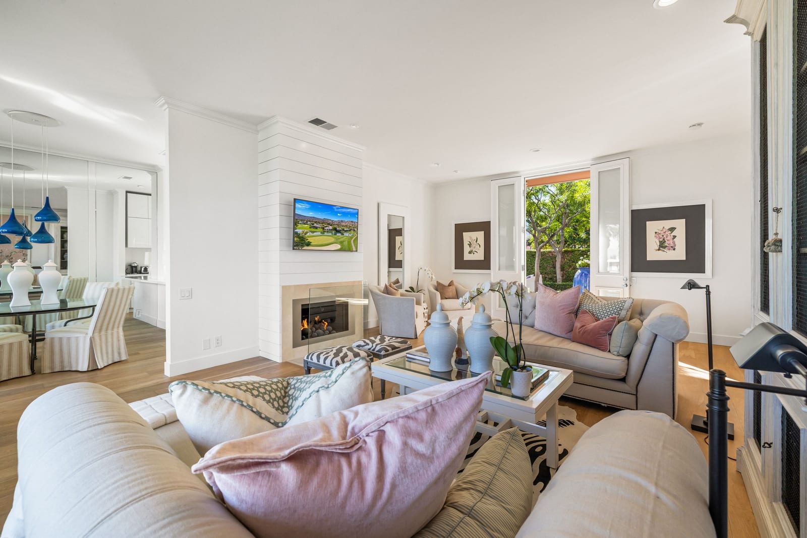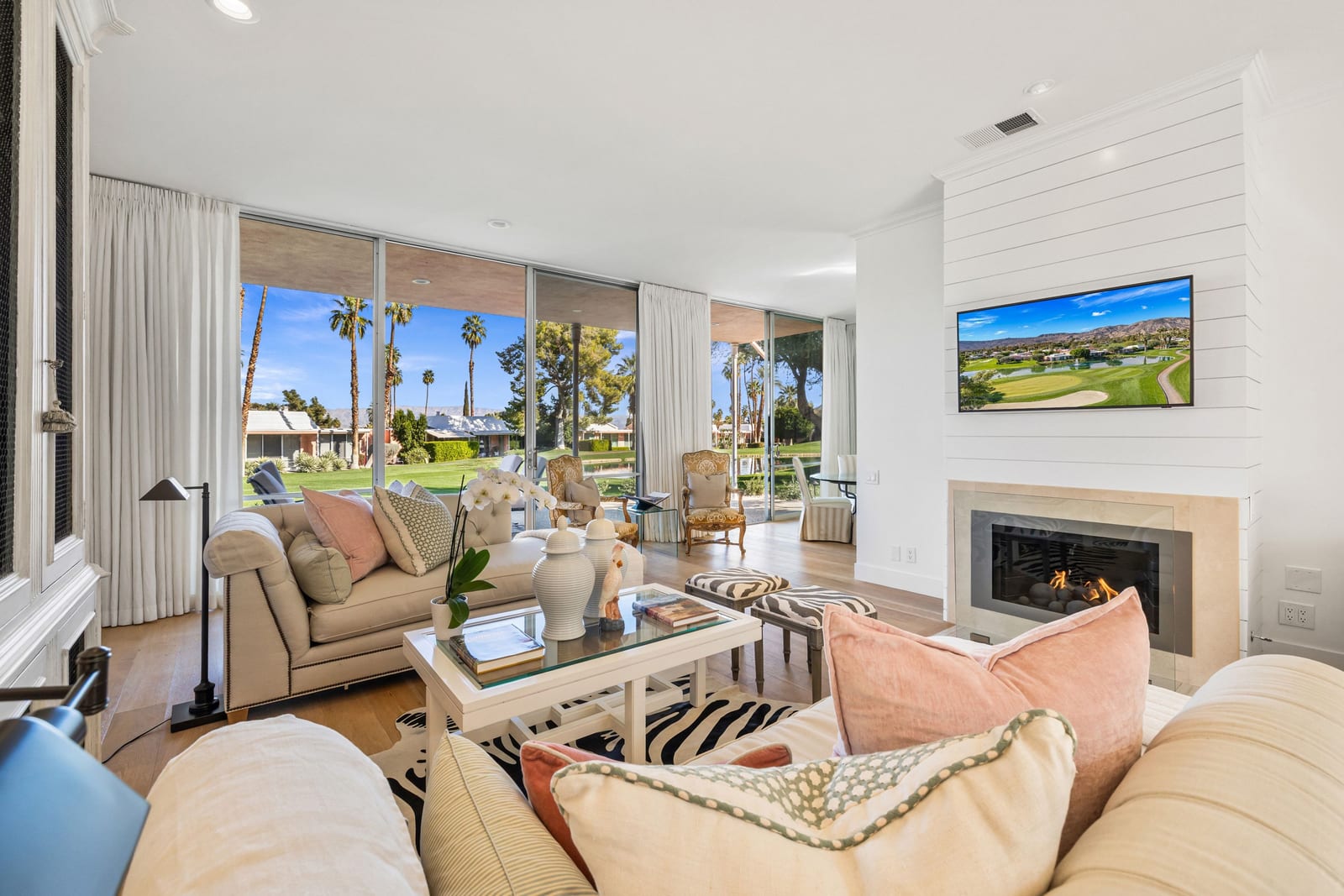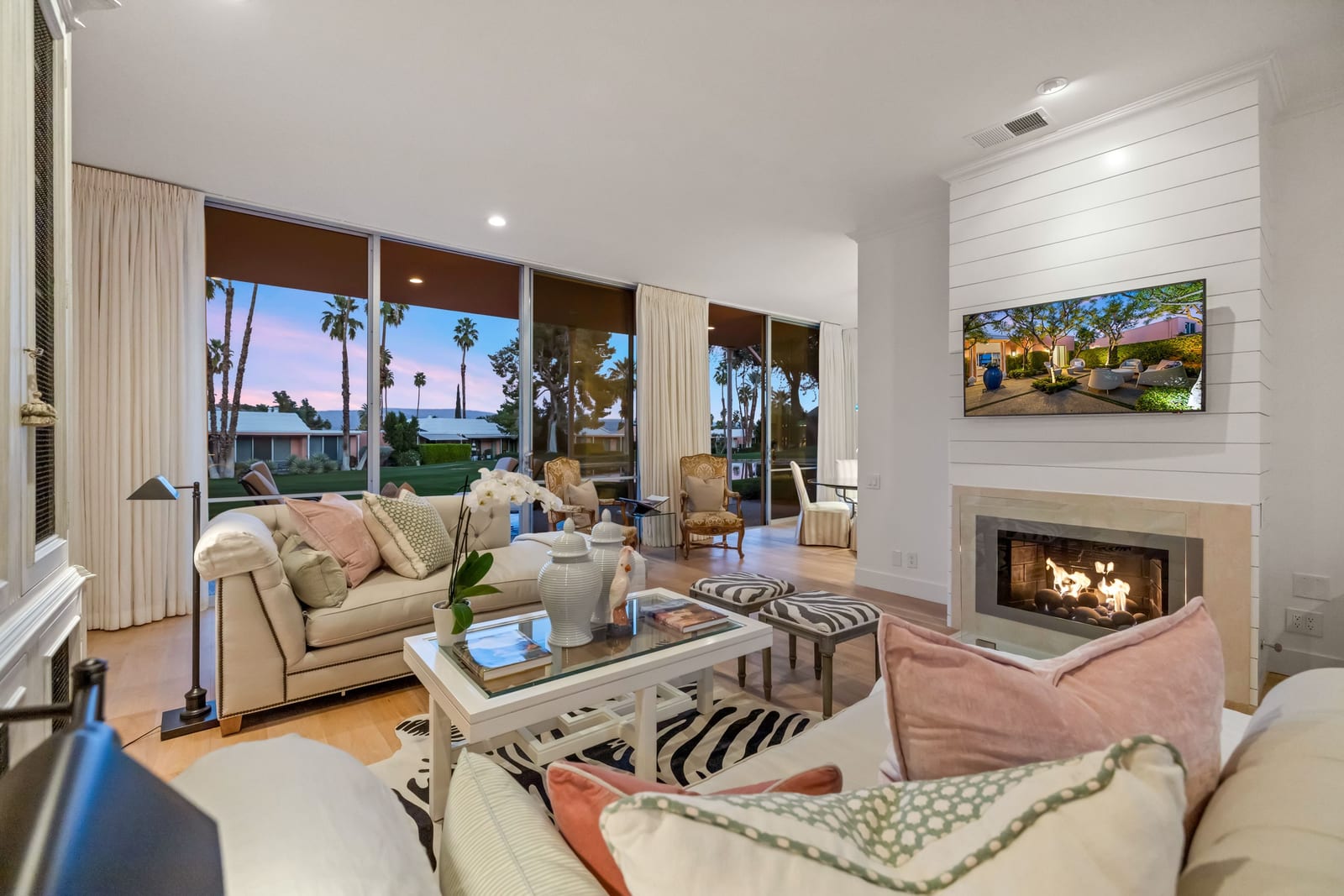 The great room features wood floors that flow throughout the home, a modern fireplace, and floor-to-ceiling windows dressed in custom drapery that frame northeasterly fairway and lake views, along with southern mountain vistas. Step outside to the wrap-around patio, recently upgraded with exposed aggregate to echo the courtyard’s elegance.