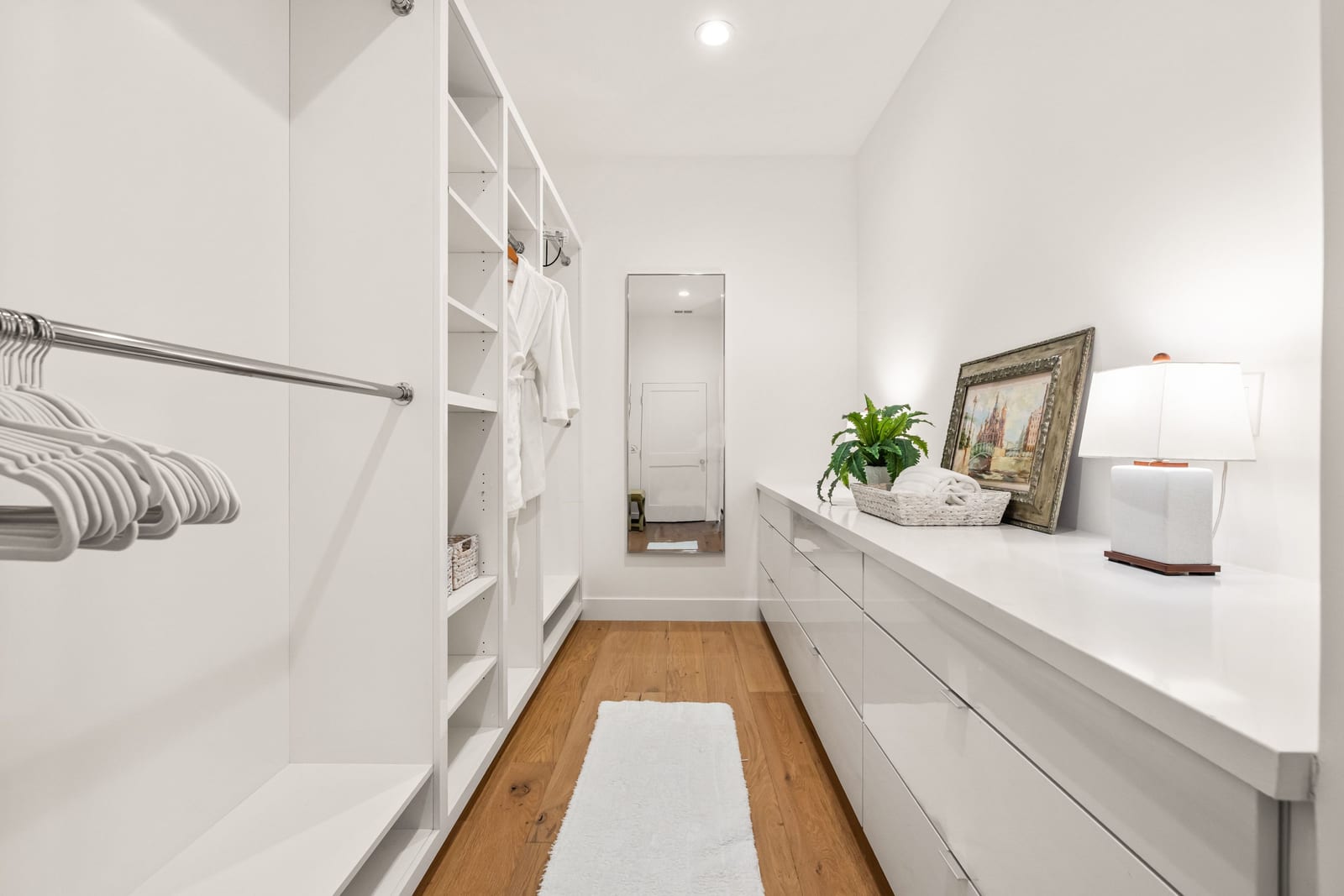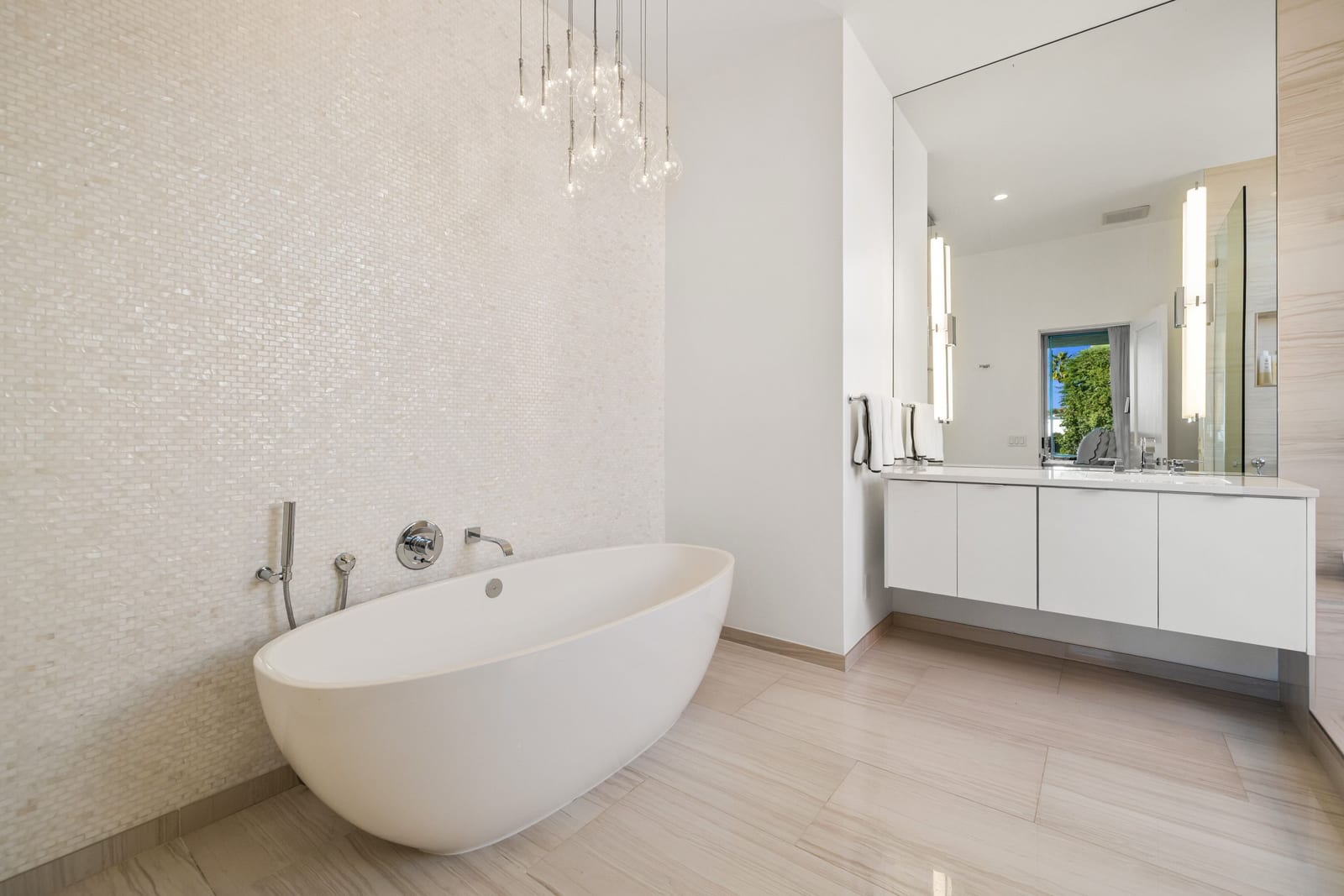 The primary bedroom is a retreat, with a luxurious ensuite that includes a spacious shower, contemporary soaking tub set against a tiled accent wall, custom cabinetry, a walk-in closet with built-ins, and an open atrium brimming with Marrakesh Pink and potted greenery.
