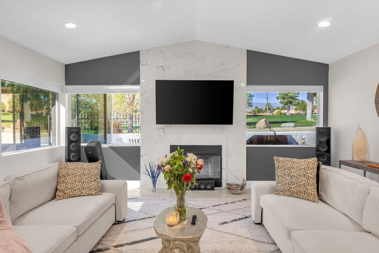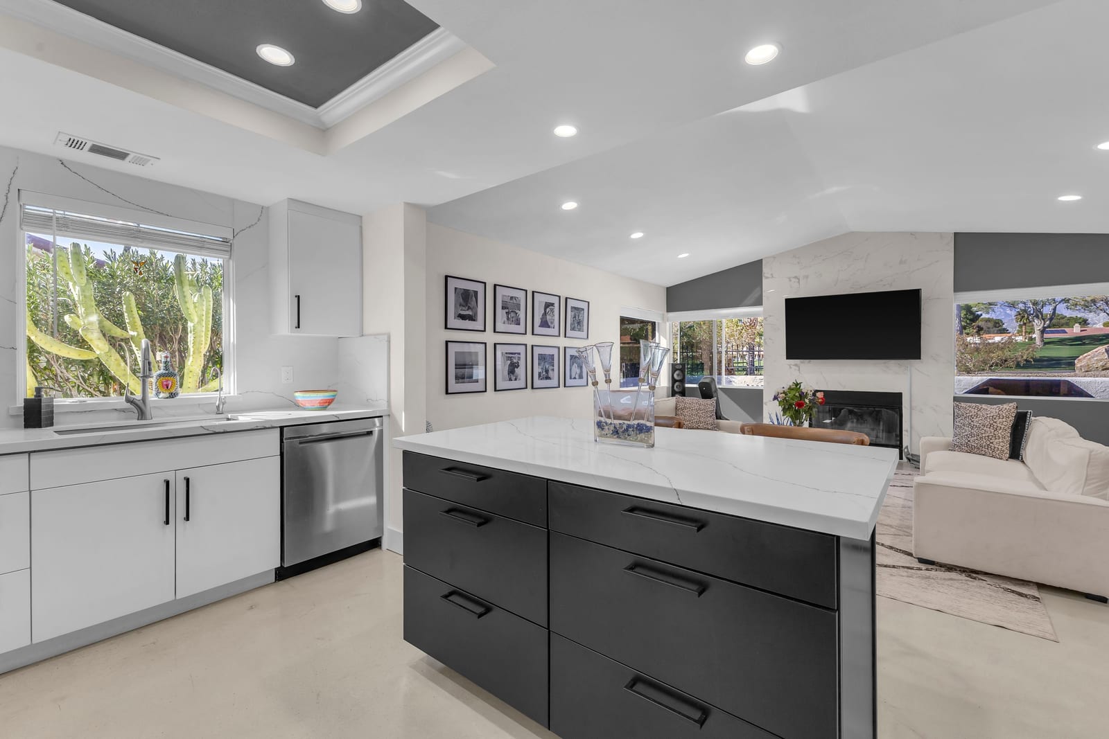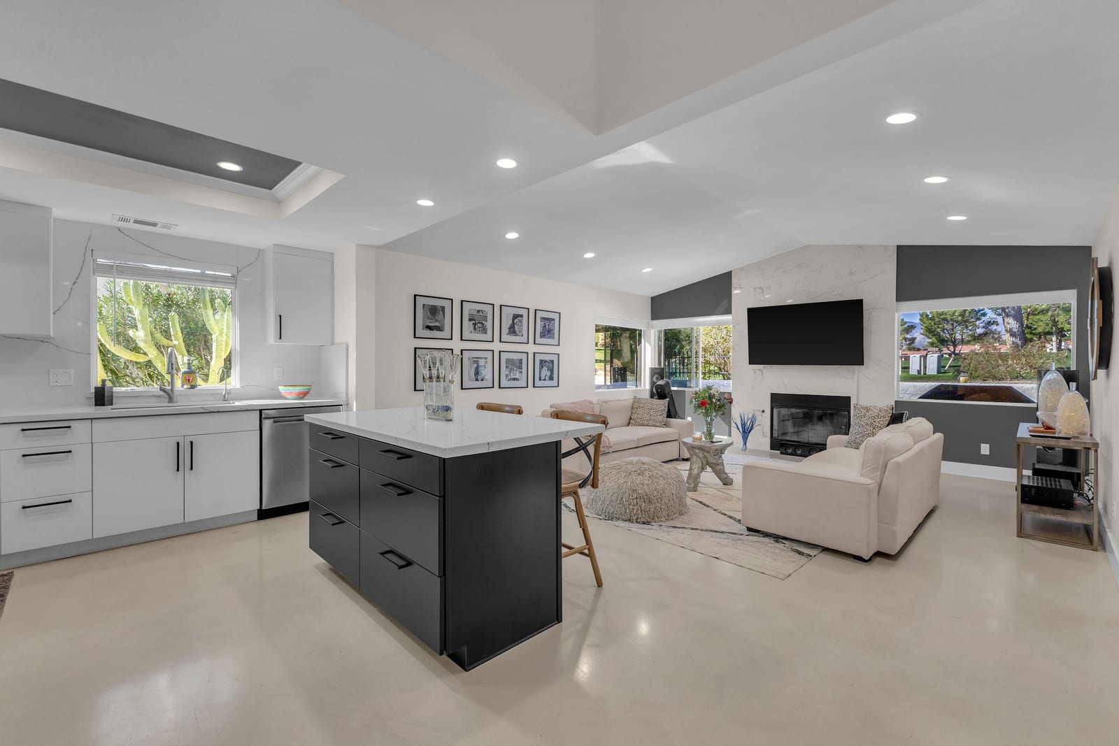 Inside, recent upgrades elevate the home throughout, including new flooring, a beautifully updated kitchen, and fresh interior paint. The light-filled, open living area is framed by large windows and anchored by a cozy fireplace, offering both comfort and style. The redesigned kitchen features generous counter space, ample storage, and a layout that flows seamlessly into the main living spaces, making it ideal for everyday living and entertaining.