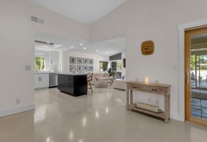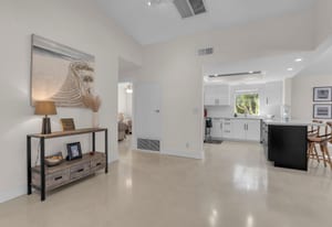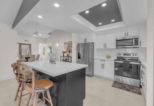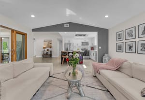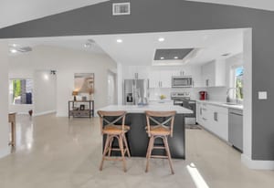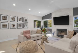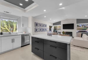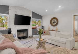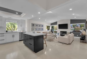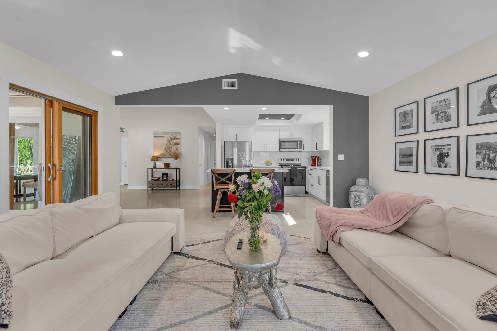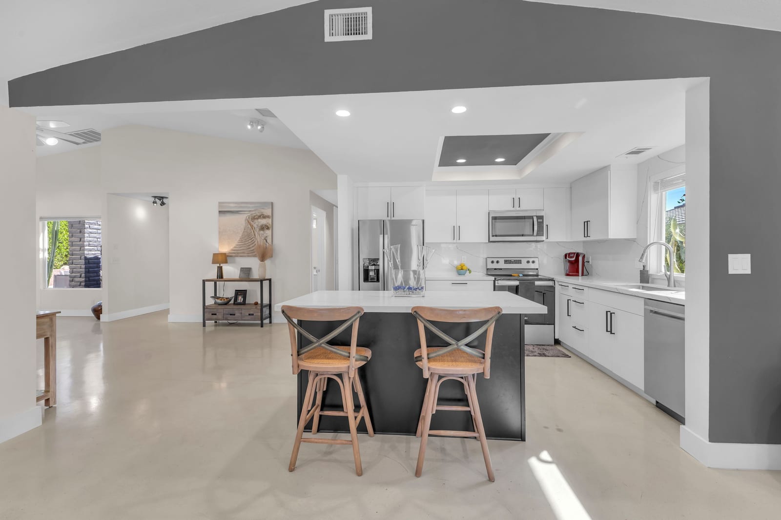 Inside, recent upgrades elevate the home throughout, including new flooring, a beautifully updated kitchen, and fresh interior paint. The light-filled, open living area is framed by large windows and anchored by a cozy fireplace, offering both comfort and style. The redesigned kitchen features generous counter space, ample storage, and a layout that flows seamlessly into the main living spaces, making it ideal for everyday living and entertaining.