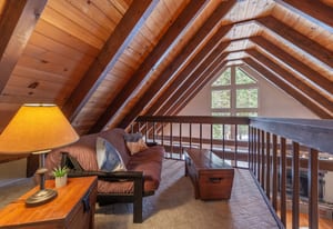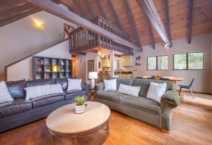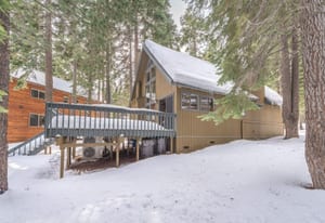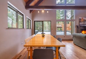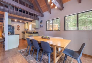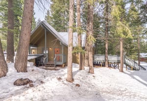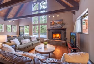 Set on a level lot in the heart of Tahoe Donner, this inviting mountain cabin blends classic warmth with thoughtful updates. Vaulted open-beam ceilings, expansive windows, and a wood-burning fireplace create a cozy, welcoming living space that opens seamlessly to an expansive deck—ideal for entertaining, relaxing, or enjoying the surrounding forest setting.