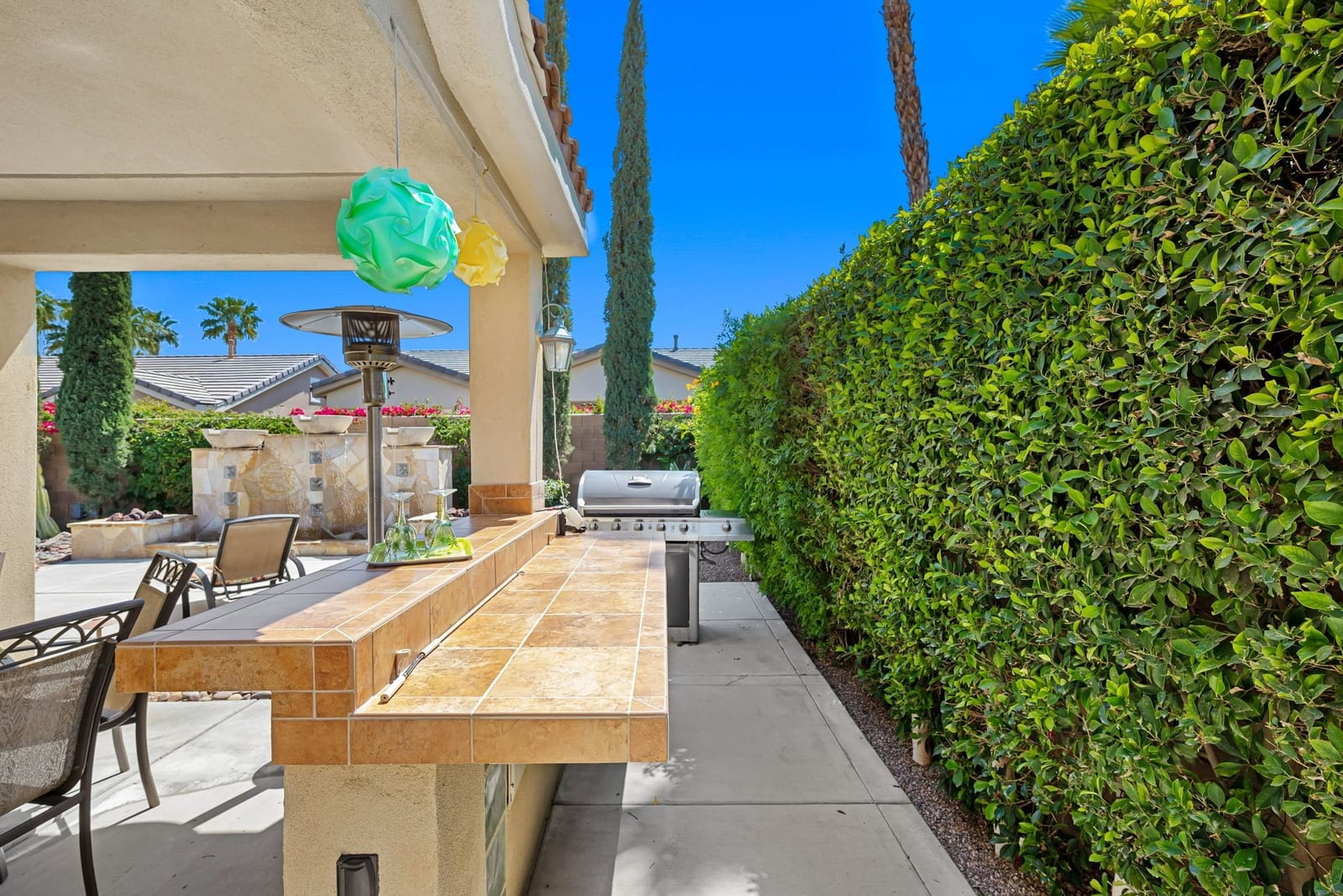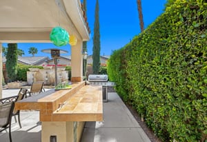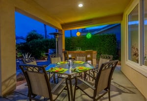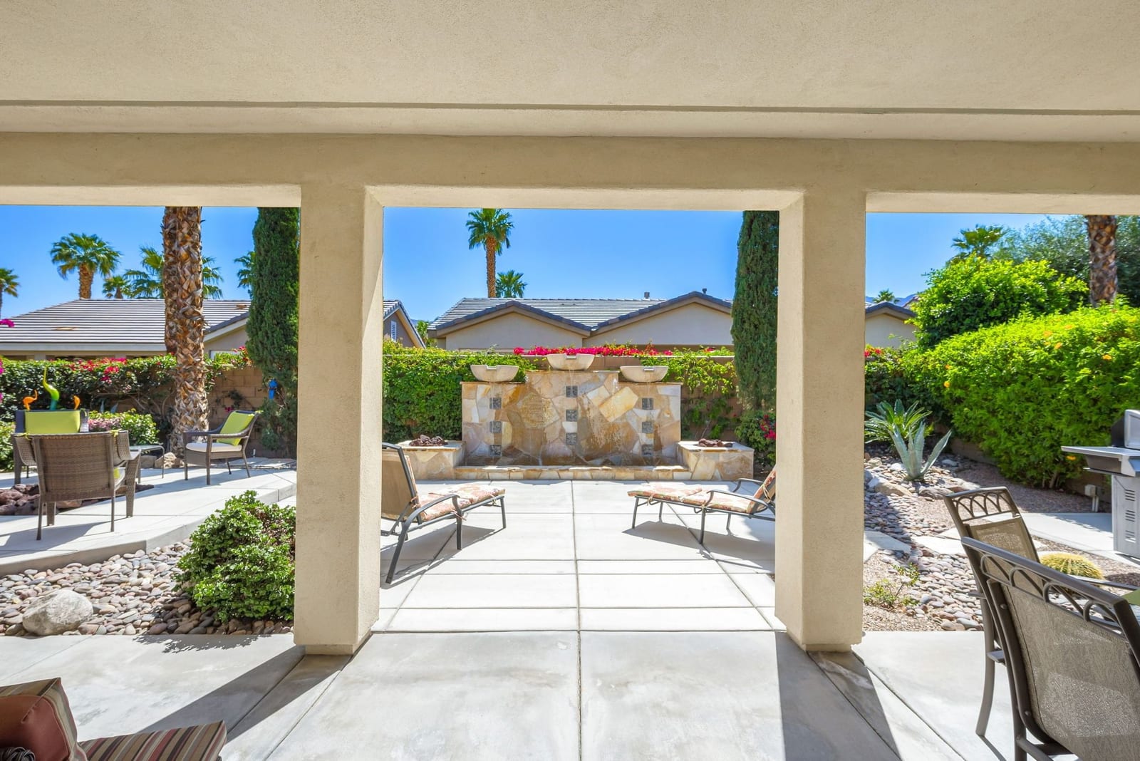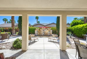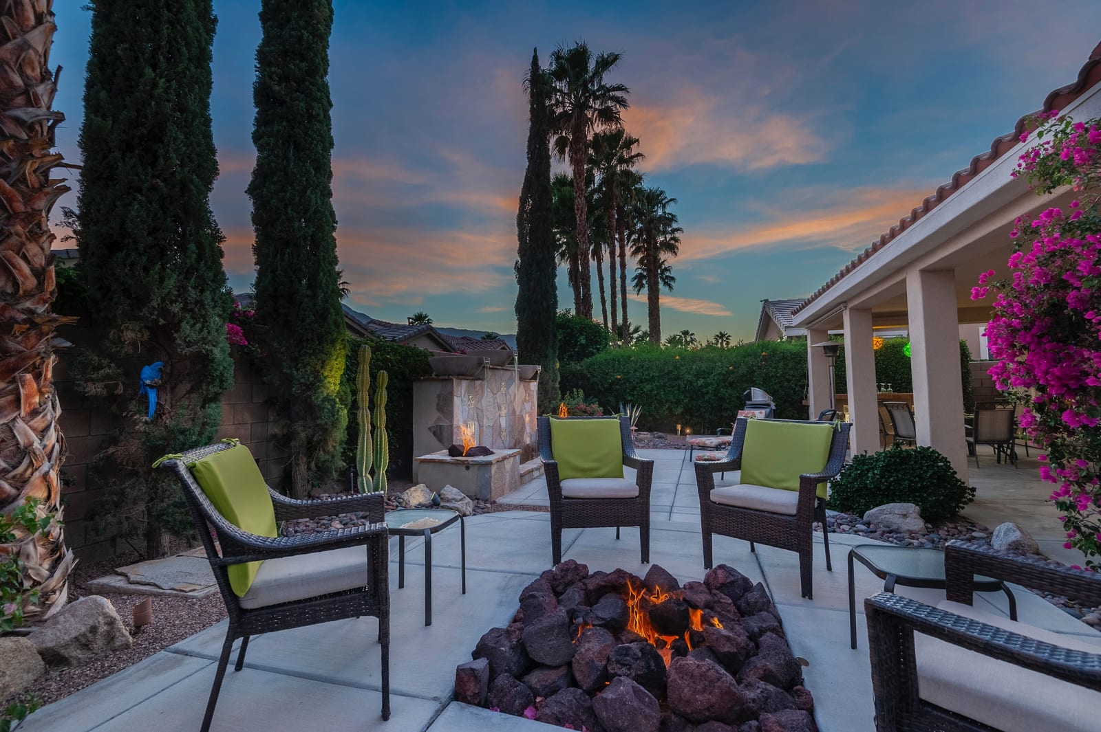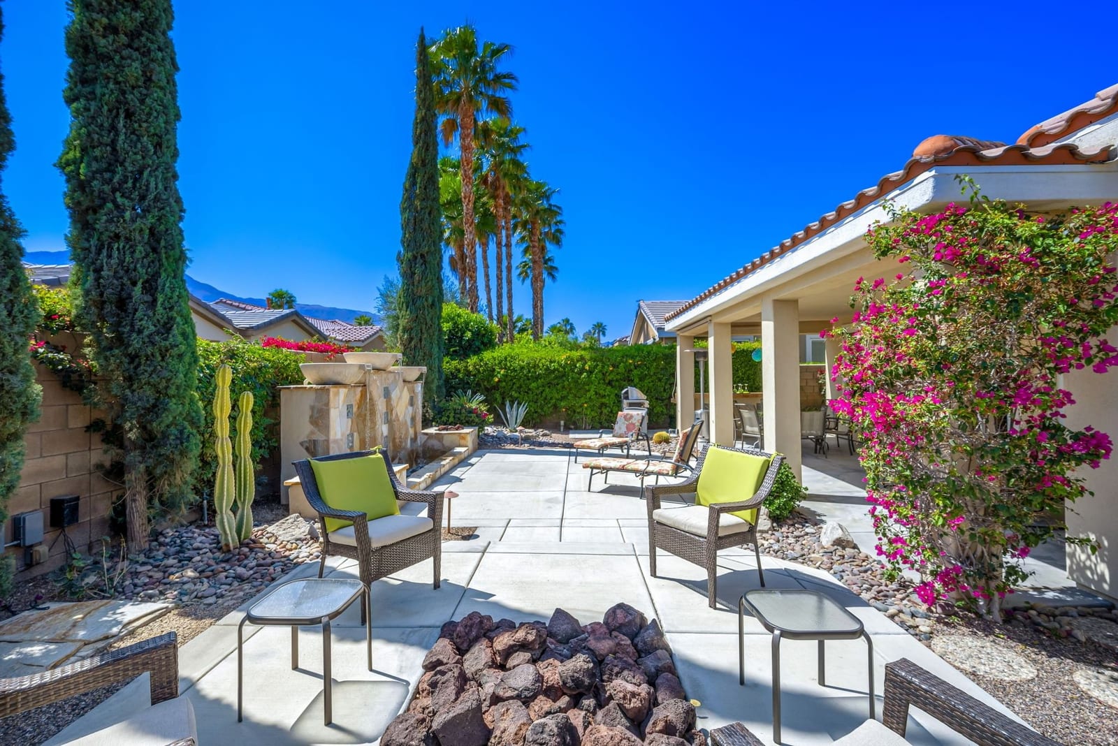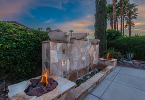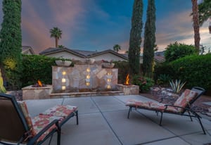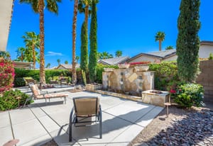 Live Life Beautifully in this bright and cheery Maurea model 1,641 SQ FT home with 3-bedrooms and 3-bathrooms including a detached Casita. Indoor, this delightful home with high ceilings and big picture windows offers exquisite contemporary built-in design elements and décor. Outdoor, the home offers the ultimate in day and night time relaxation and entertainment with peak-a-boo southern mountain views and custom features, including a luxurious cascading waterfall with built-in glass-block lighting and blazing fire bowls on either side, a built-in bar and BBQ area, and raised patio with seating around a lava stone firepit. The home is available Turnkey furnished including the beautifully curated furnishings and interior décor. The kitchen, dining, and great room flow seamlessly making the home feel much larger. The great room has crown molding and a custom crafted media center with linear fireplace, glass tile surround, and built-in big-screen TV. The kitchen meets every cook's needs, with gas cooktop and range, new microwave, dishwasher, beautiful wood cabinets and smooth slab granite on the kitchen counters. The kitchen and dining areas are open to the great room keeping you engaged with family and friends while cooking and entertaining. The primary bedroom suite is spacious and elegant, and the bathroom features dual vanities, a large walk-in shower with travertine stone surround, a linen-closet, and large walk-in closet. The guest bedroom is roomy with a mirrored closet and is located next to a full guest bath. Guests will love the privacy of the roomy detached Casita with closet and full bath. The garage has storage and fits 2-cars and a golf cart.