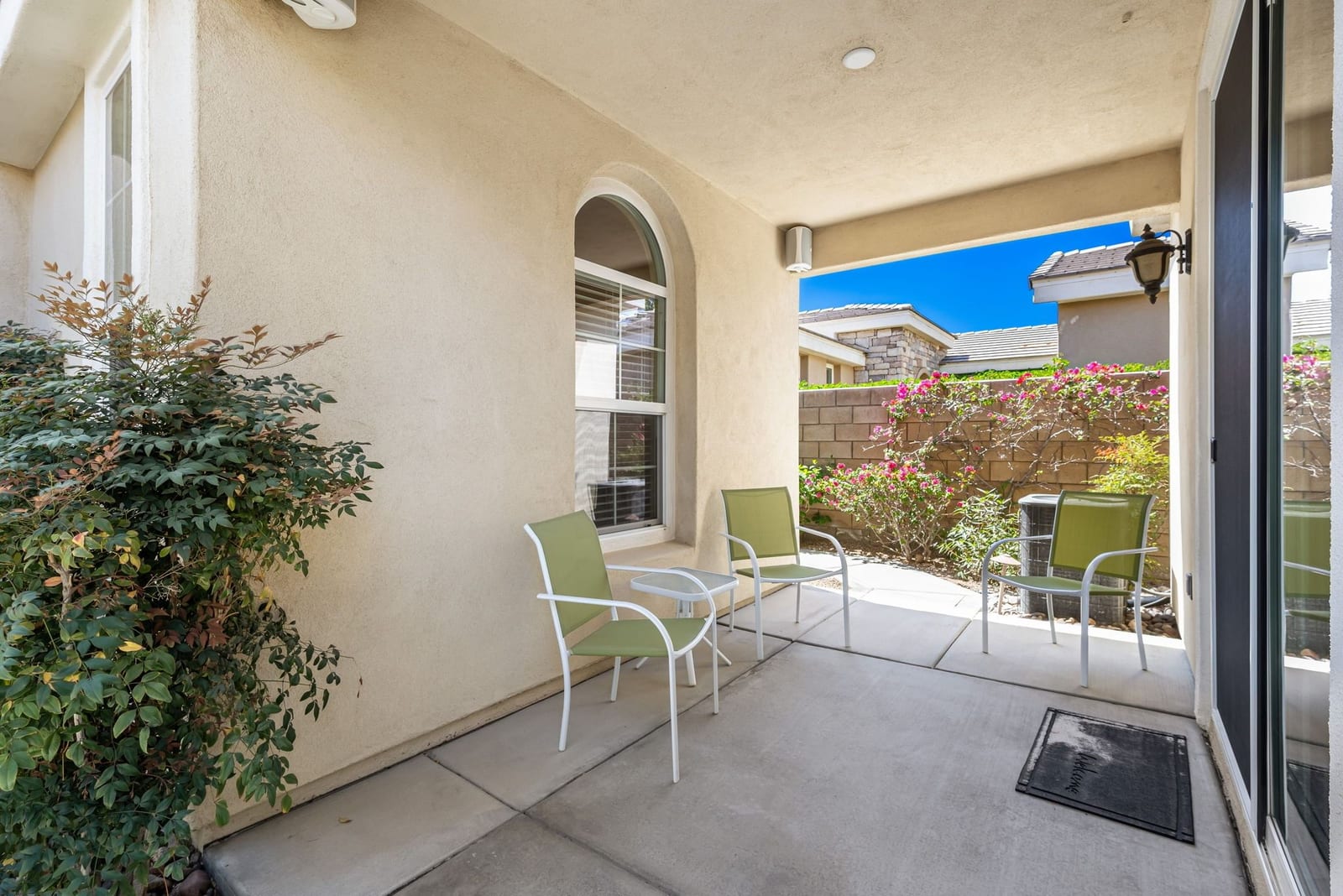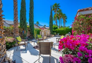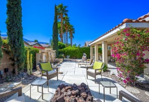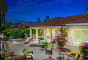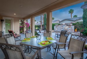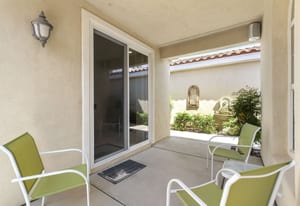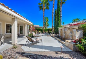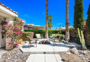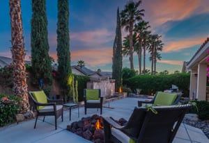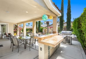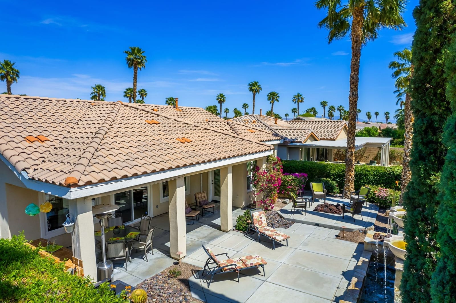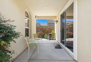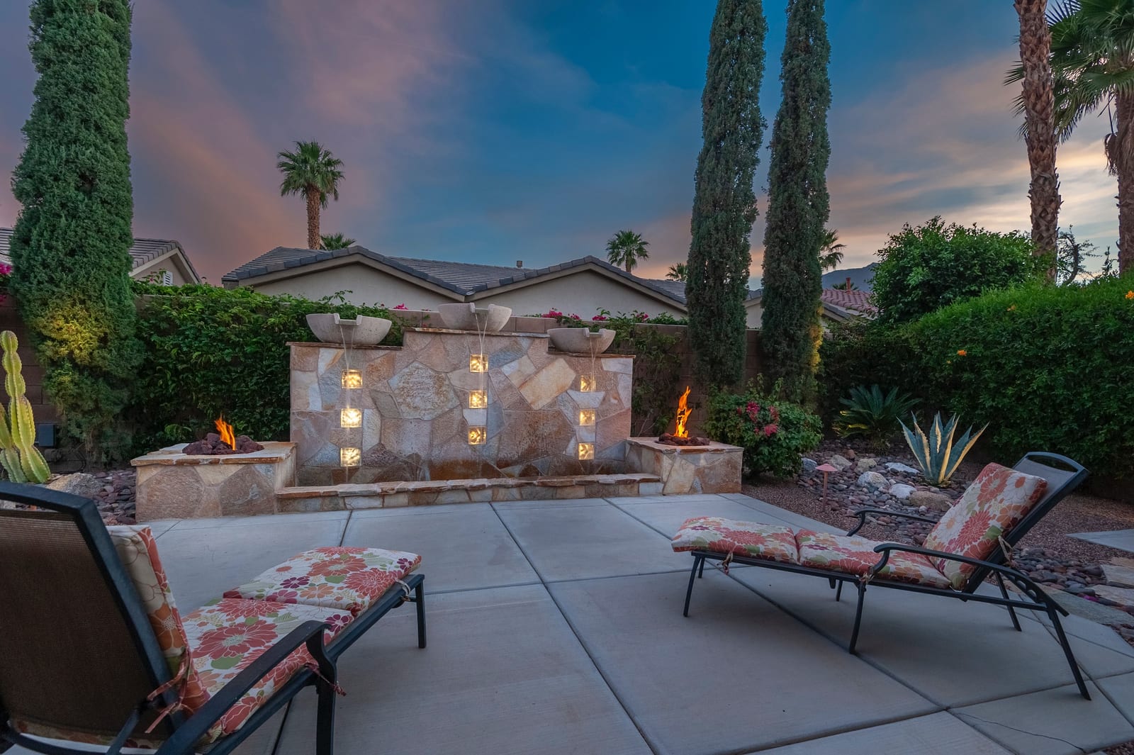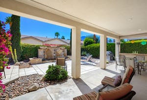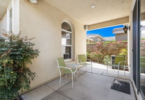 Live Life Beautifully in this bright and cheery Maurea model 1,641 SQ FT home with 3-bedrooms and 3-bathrooms including a detached Casita. Indoor, this delightful home with high ceilings and big picture windows offers exquisite contemporary built-in design elements and décor. Outdoor, the home offers the ultimate in day and night time relaxation and entertainment with peak-a-boo southern mountain views and custom features, including a luxurious cascading waterfall with built-in glass-block lighting and blazing fire bowls on either side, a built-in bar and BBQ area, and raised patio with seating around a lava stone firepit. The home is available Turnkey furnished including the beautifully curated furnishings and interior décor. The kitchen, dining, and great room flow seamlessly making the home feel much larger. The great room has crown molding and a custom crafted media center with linear fireplace, glass tile surround, and built-in big-screen TV. The kitchen meets every cook's needs, with gas cooktop and range, new microwave, dishwasher, beautiful wood cabinets and smooth slab granite on the kitchen counters. The kitchen and dining areas are open to the great room keeping you engaged with family and friends while cooking and entertaining. The primary bedroom suite is spacious and elegant, and the bathroom features dual vanities, a large walk-in shower with travertine stone surround, a linen-closet, and large walk-in closet. The guest bedroom is roomy with a mirrored closet and is located next to a full guest bath. Guests will love the privacy of the roomy detached Casita with closet and full bath. The garage has storage and fits 2-cars and a golf cart.