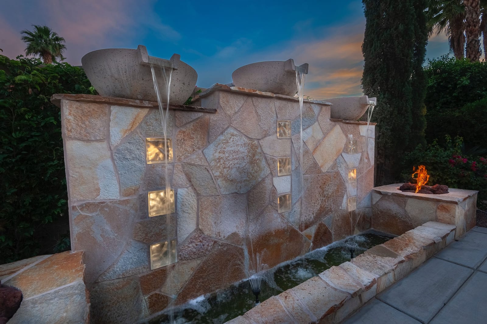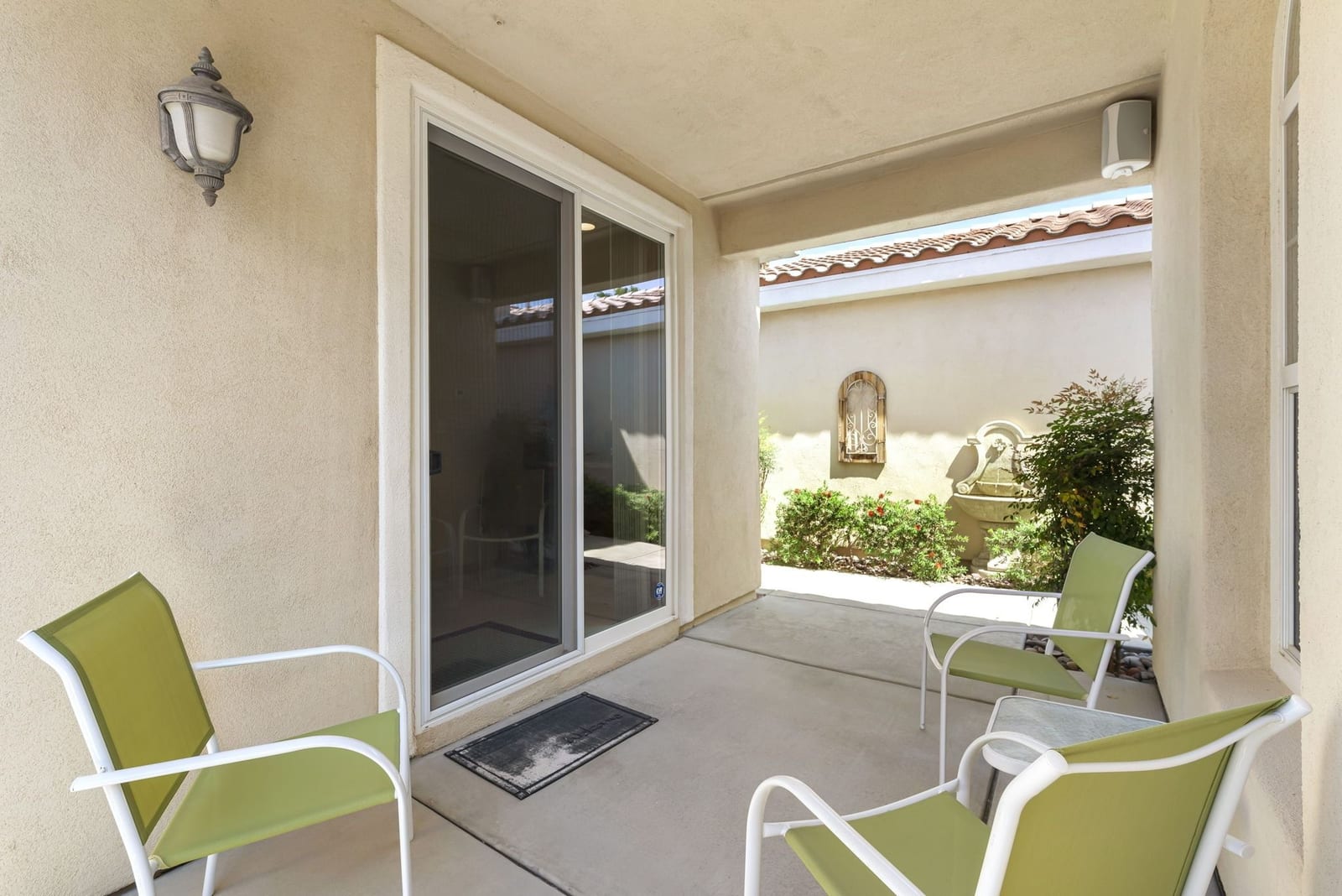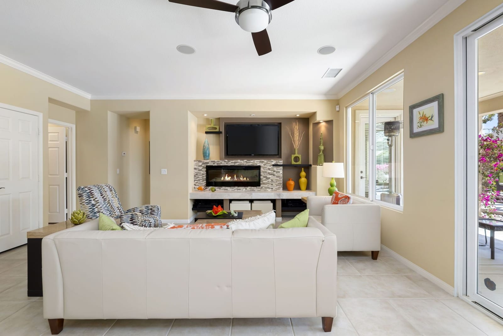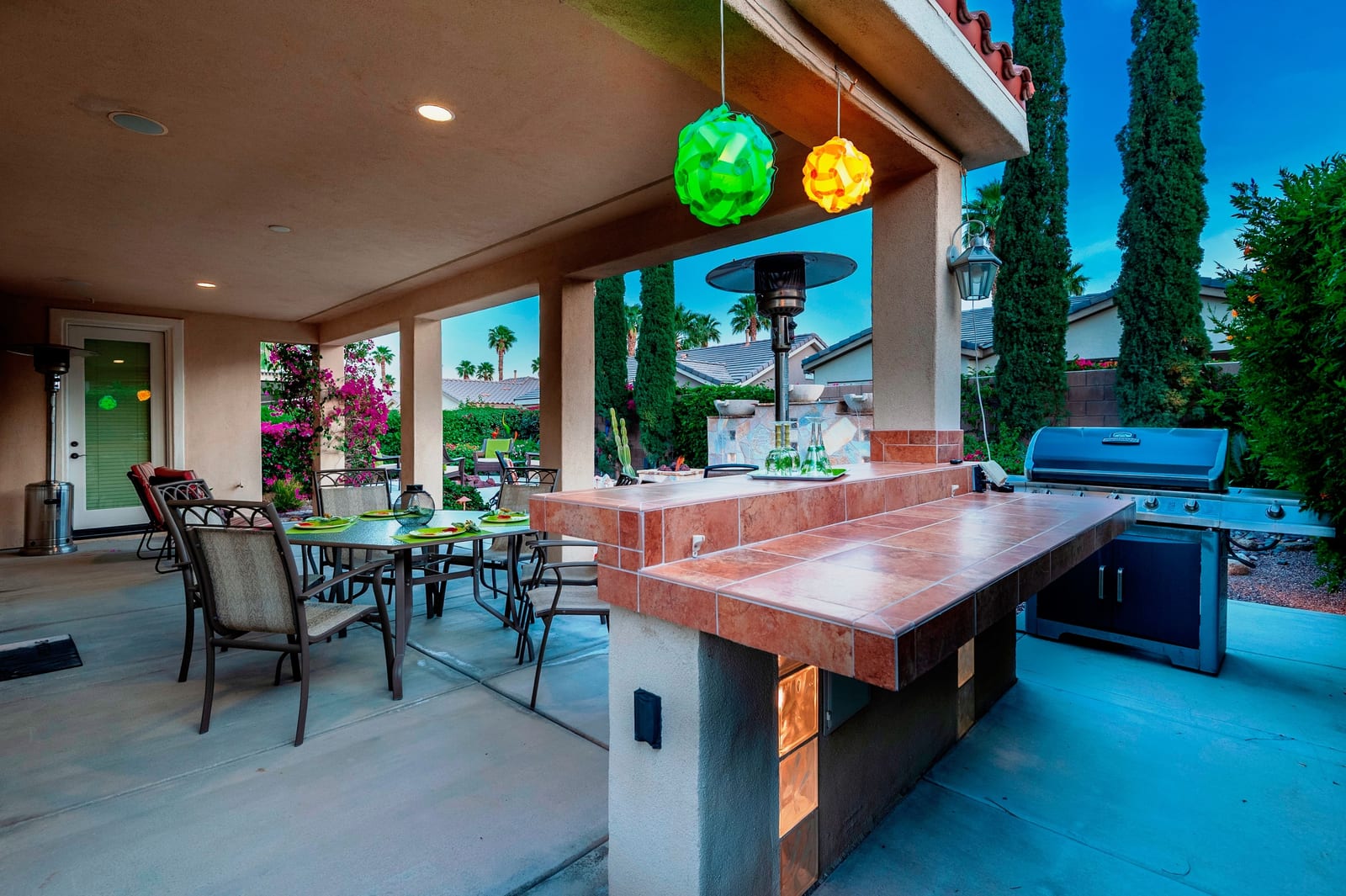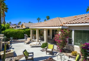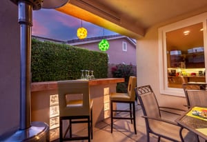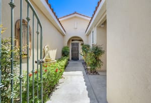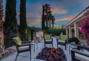 Live Life Beautifully in this bright and cheery Maurea model 1,641 SQ FT home with 3-bedrooms and 3-bathrooms including a detached Casita. Indoor, this delightful home with high ceilings and big picture windows offers exquisite contemporary built-in design elements and décor. Outdoor, the home offers the ultimate in day and night time relaxation and entertainment with peak-a-boo southern mountain views and custom features, including a luxurious cascading waterfall with built-in glass-block lighting and blazing fire bowls on either side, a built-in bar and BBQ area, and raised patio with seating around a lava stone firepit. The home is available Turnkey furnished including the beautifully curated furnishings and interior décor. The kitchen, dining, and great room flow seamlessly making the home feel much larger. The great room has crown molding and a custom crafted media center with linear fireplace, glass tile surround, and built-in big-screen TV. The kitchen meets every cook's needs, with gas cooktop and range, new microwave, dishwasher, beautiful wood cabinets and smooth slab granite on the kitchen counters. The kitchen and dining areas are open to the great room keeping you engaged with family and friends while cooking and entertaining. The primary bedroom suite is spacious and elegant, and the bathroom features dual vanities, a large walk-in shower with travertine stone surround, a linen-closet, and large walk-in closet. The guest bedroom is roomy with a mirrored closet and is located next to a full guest bath. Guests will love the privacy of the roomy detached Casita with closet and full bath. The garage has storage and fits 2-cars and a golf cart.
