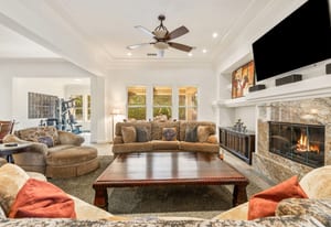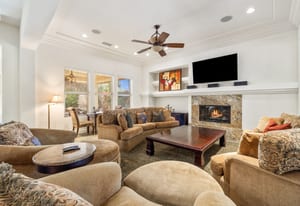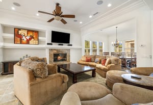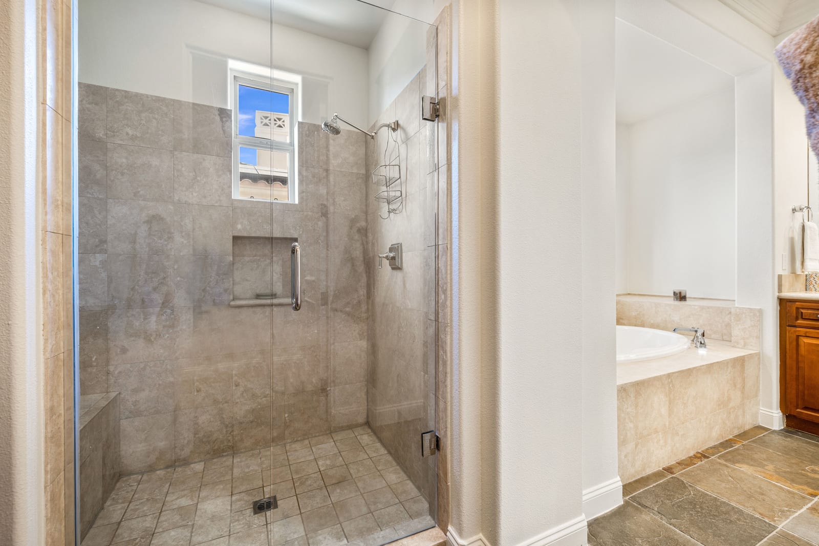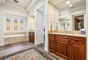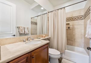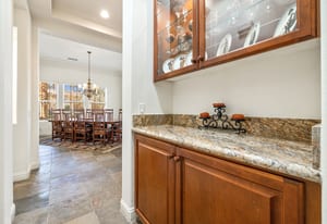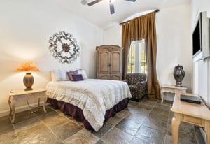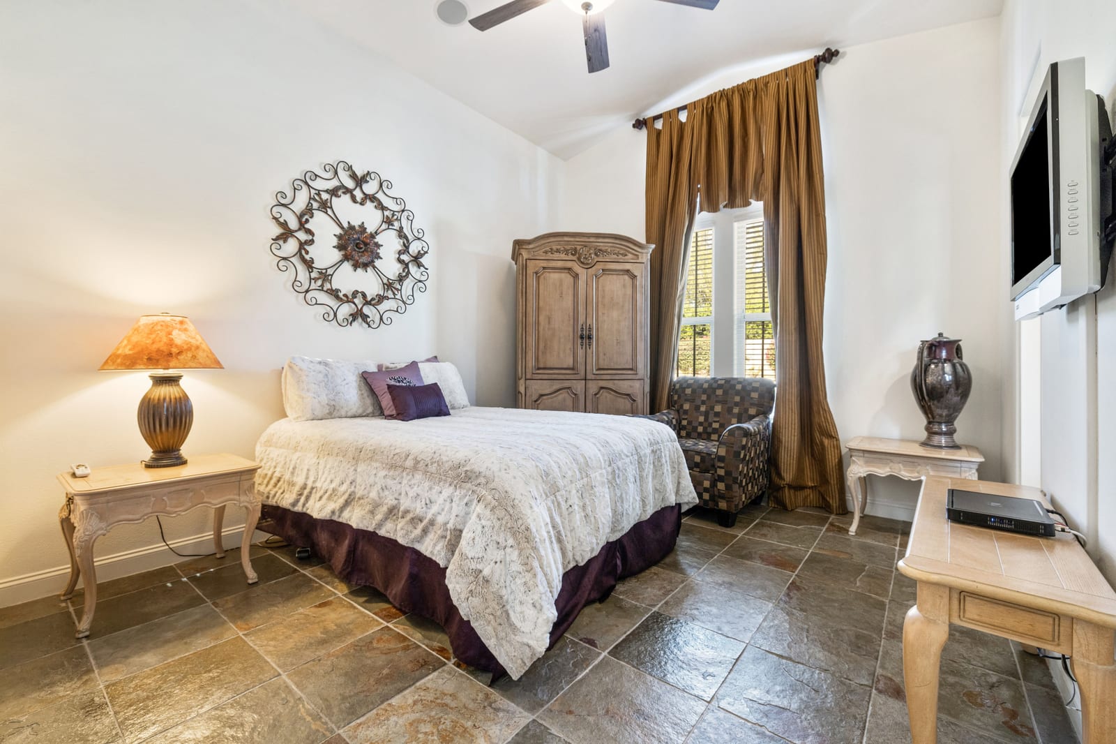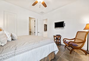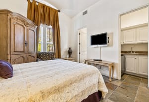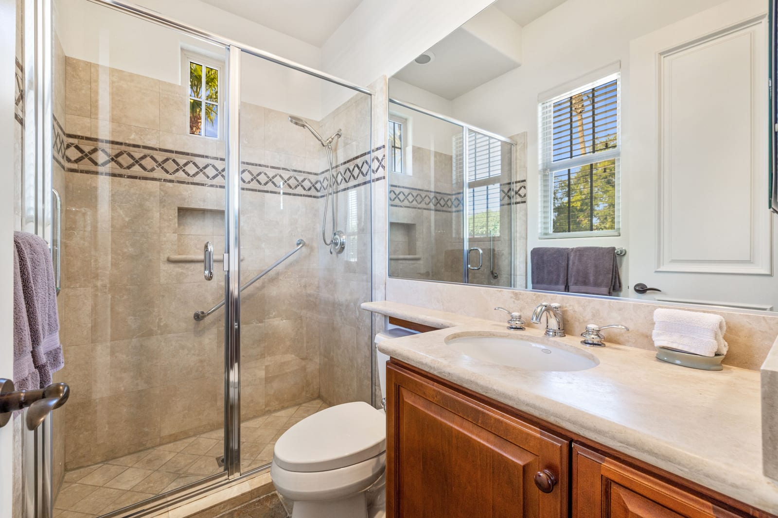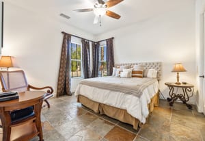 The residence boasts three bedrooms and four bathrooms designed with thoughtful details to ensure your utmost comfort. The primary bedroom includes a large walk-in closets providing ample storage for personal items. The main guest bedroom is set up as an in-law suite with a built in kitchenette. A second on-suite guest bedroom and a separate office round out the design.