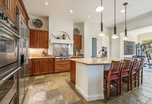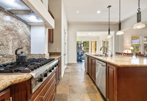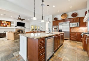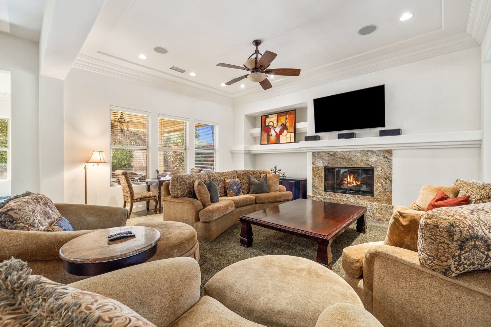The outside of this home is just as appealing as its interior. A south-facing backyard awaits where you can soak up the California sunshine. The recently renovated pool and spa offer an inviting spot to relax or entertain guests. An additional feature that sets this property apart is the sunken outdoor kitchen – ideal for hosting memorable gatherings amidst beautiful surroundings.